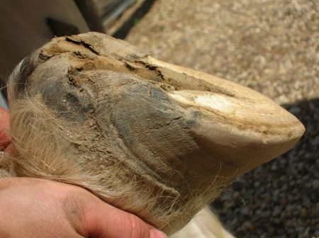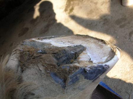| Dire merci | Voici l'antérieur de mon hongre de rando en mars 2007, déformé par 7 ans de ferrures: il est devenu oval, fermé en talons et quartiers...![]() Le même pied 3 mois plus tard environ, il a plus du tout la même forme: ouvert en talons et quartiers, c'est bien plus naturel! par contre, la photo a été prise avant le parage, d'où le côté pas très propre... ![]() Là, le même pied en mars 2007, même jour que la première photo au-dessus, mais vue latérale pour montrer le manque flagrant de concavité: il avait les pieds plats, la fourchette arrive au niveau du bord d'appui; à cette époque, il marchait sur des oeufs, même sur l'herbe. ![]() Le même pied en janvier 2008, après un changement dans l'habitat des gros: la concavité est là, il galope même sur du gravat de la taille du poing et sur le sol gelé. ![]() |