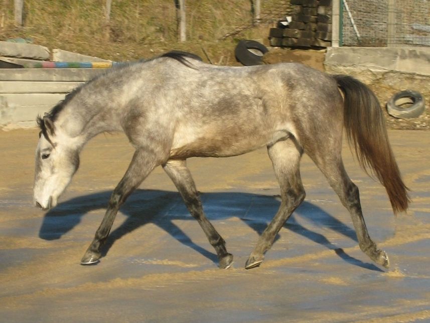 | Dire merci | Nous avons une "R" Ruksana débourrée en aout, AA de son état par Quercus du Maury (pour les connaisseurs) c'est celle de mon mari. Elle apprend très vite, elle travaille tous les week end en carrière (donc 1x/ semaine), et se débrouille que certains + vieux. A un équilibre au galop a en faire palir plus d'un .On sort aussi en extérieur, la miss passe en tête et respecte bien son cavalier... un peu plus con avec les autres chevaux... l'autre jour elle a senti le cheval d'un copain, et c'est retournée en un quart de seconde et tapée... action - réaction de mon mari qui l'a vivement répprimandé... (c'est le copain qui c'est pris le coup de pied ) Photo de la miss lors de son débourage : ![]() il y a 3 semaines ![]() ![]() ![]() |