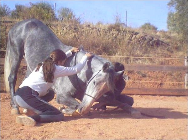 | Dire merci | DONC, pour la mise à genoux:(ma technique) Il faut avant tout que ta Lana maîtriseparfaitement la révérence des deux côtés, à la main. Une fois celà fait, il te reste à passer à la demande au stick, notament afin de préparer l' éxercice en selle. Pour ce faire, tu tapotes gentiment mais fermement l' antérieur de ta jument, au niveau du pli du genou, jusqu' à ce qu' elle le pose à terre. Avec le même ordre vocal pour l' aider et patience pour ne pas la brusquer. (Il s' agit en fait d' un éxercice assez naturel pour les chevaux, car étant poulains -et parfois adultes- en jouant ils se mordent à cet endroit afin de mettre à terre l' "adversaire" de jeu) Une fois celà acquis, tu peux passer à la demande de la mise à genoux, pour préparer le couché. Tu gardes un côté (généralement le gauche) pour la révérence que tu gardes intacte. A droite, au lieu de ne trapoter que l' antérieur droit, tu tapotes les deux, avec un nouvel ordre vocal, jusqu' à ce que Lana se mette à genoux, dans une continuité logique. Une fois l' éxo compris, alors seulement tu pourras doucement l' inciter à se coucher. ![]() Celà dit, je le répète, mais prends bien ton temps! Le couché n' est pas un éxercice en soi difficile, mais néanmoins délicat moralement, demandant au cheval beaucoup de confiance (en toi et l' environnement) et de soumission... En plus, ça vaut le coup d' y aller doucement, parce que vous faites du bon travail toutes les deux (et vous y arriverez, c' est sûr), et en prenant votre temps, vous allez justement en gagner au final! ![]() |