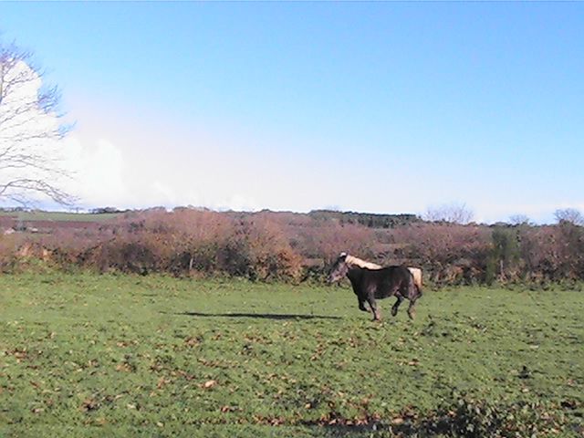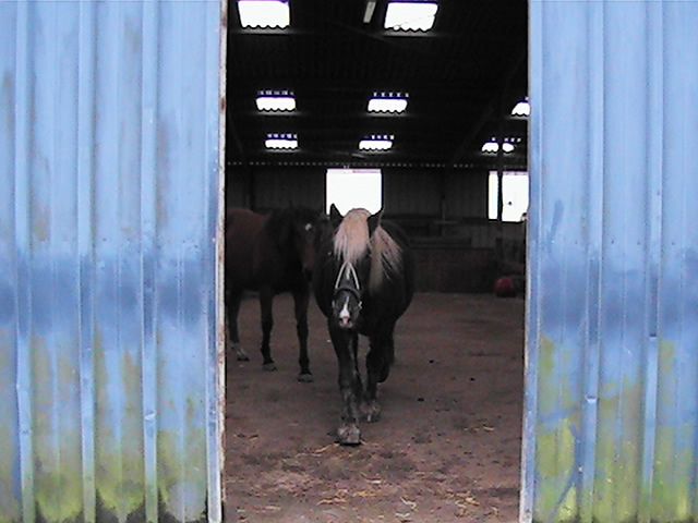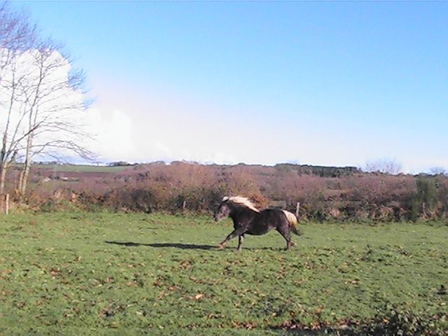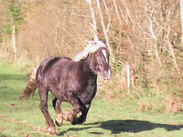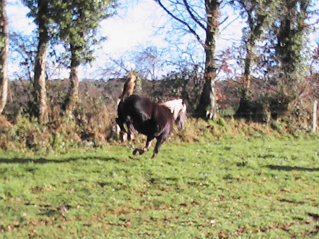 | Dire merci | je voudrais juste me faire plaisir avec : balade et rando, et puis aussi, qu'elle me fasse quelques poulains demi-trait de sa robe....Pour le manniquenat et l'admiration, elle n'a pas trop le profil idéal! Pour son caractère, tu parlais plutot monté ? Pour le moment, elle est assez allante, un peu sur l'oeil; mais même monté, comme elle est "bonne pâte", elle ne dit pas non; pour l'instant, elle dit juste "au secours" quand elle a peur et "je mange un peu" quand elle voit un truc bon; elle a aussi tendance à renifler partout par terre...donc, c'est assez chaint car je veux la laisser toucher un maximum de choses, mais un moment c'est gonflant, car elle veut tout aller voir ; comme le tracteur l'autre fois qui était super loin, si je l'avais laisser faire, je crois qu'elle serait aller voir en passant tou droit à travers champ ; parecqu'en plus, c'est un vrai tank : elle peut passer partout, rien ne l'arrête! elodye : merci, ca fait plaisir un petit mot de ceux qui aiment ma petite patate! |