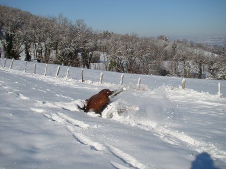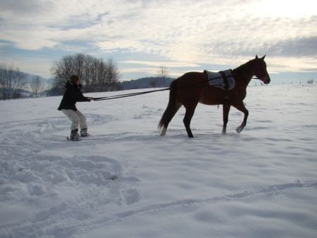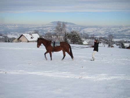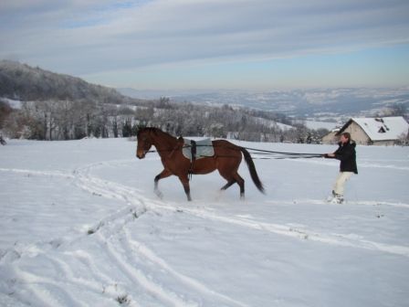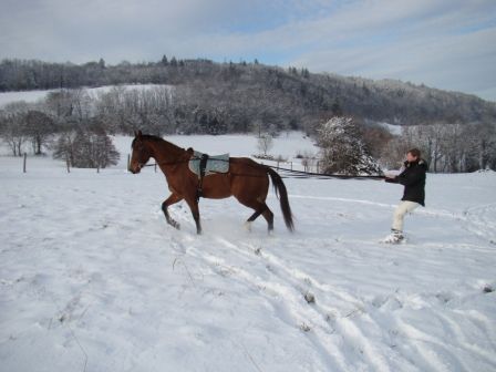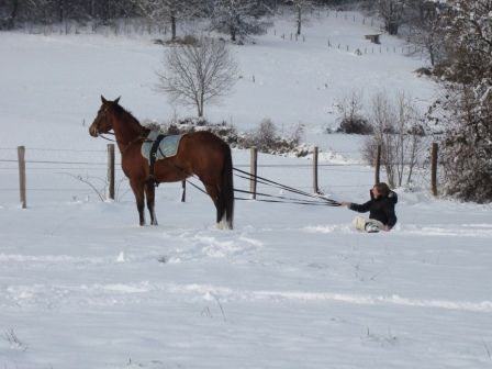 | Dire merci | Une fois revenue au calme je décide de tenter du ski joering!!!! Les débuts sont un peu difficile... Elle a du mal à comprendre ce que je lui demande... Elle tourne en rond... ![]() Marche un peu droit... ![]() ... mais rapidement, c'est le drame! Elle part au trot en direction de la maison, je lache tout!! Un cheval tout seul!! Heureusement que la porte du pré était fermé, j'ai pu la récupérer facilement!! ![]() Puis on retente mais cette fois avec mon frère qui reste à la tête. Elle commence à comprendre! Donc mon frère s'éloigne et ça marche comme sur des roulettes! Elle comprend vite ma belle! ![]() ![]() |