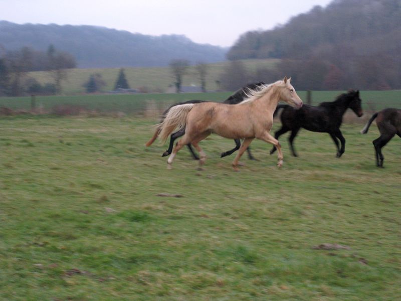 | Dire merci | Une juju avec un très beau palo, en pension à l' élevage... Et peut-être futur fiancée du beau blond...![]() ![]() ![]() ![]() Et on fait bouger la bête... ![]() ![]() ![]() ![]() (Idem, petite vidéo à la fin) ... Voilà pour ces messieurs. ![]() On passe alors aux dames. Et à celle que je venais voir en particulier, la belle Laïka. Les nenettes sont logées en troupeau dans un grand parc. Pour autant, elles ne sont pas sauvages pour deus sous, et lorsque nous essayons de les faire fuire afin qu' elle nous montre encore une fois leur allures, ça n' est jamais bien loin et sans quelques tentatives de leur part de revenir.... Et alors, moi qui n' aime pas les jument, hop, première surprise en la personne de Tariqa! Fille de leur ancien étalon et d' une jument présentée plus bas, pouliche de bientôt deux ans, baie, avec un modèle superbe et un caractère attachant, il faut l' avouer...: ![]() ![]() ![]() A son âge, boudiou, elle est fichue comme un mâle, et un beau! ![]() Le reste du troupeau, dans lequel on aperçoit un petit cul blond... Le petit cul que je voulais voir justement! ![]() ... La belle Laïka du Vallois, DSA champagne or! ... Et là, mon petit coeur il en a pris un sacré coup! ![]() (suite) |