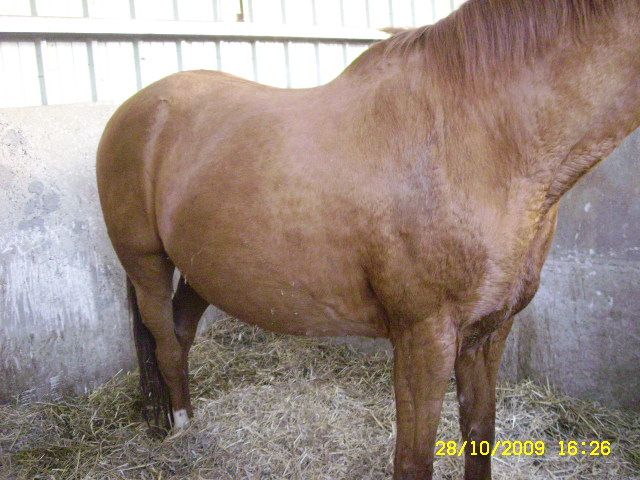 | Dire merci | la notre ce n'est pas flagrant non plus, elle a moin de ventre que ma jument trop grosse et mon hongre balloné , mais ce qui la démarque c'est que le ventre est gonflé vers l'arrière, ca fait vraiment tendu prêt du grasset |