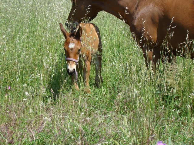| Dire merci | C'est un petit mâle bai, avec une jolie liste très rigolote... Une photo (pas jolie !) du bonhomme a quelques heures de vie : ![]() |