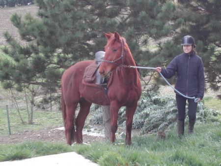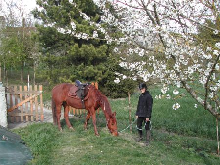 Déconnecté | pour suivre la petite histoire, elle a était remise à l'association par son ancienne proprio qui ne pouvait plus la garder. je lui ai téléphoner pour me renseigner au plus possible sur Queria et là on me dit que: -elle ne reste pas à l'attache seule sinon elle casse tout -si madame ne veut pas donner ses sabots et bien elle ne les donnes pas -quand on distrbue la ration, on pose le saut et on part en courant parce qu'elle charge et qu'elle pourrait aussi nous coincer dans le box pour nous botter -elle ne sort jamais toute seule en ballade... ![]() (à l'association on m'avait dit que Queria avait été beaucoup trop gatée et du coup qu'elle n'avait aucun respect pour les humains), m'en fiche je la voulait! donc quelques jours après son arrivée au pré et sa familliarisation avec les lieux, je décide de lui faire une scéance pansage avec au programme: démélage des crins et curage des pieds + graissage. J'y ai passé plus d'une heure! à peine je la touche avec la brosse elle bougeait et faisait mine de mordre, pour les pieds elle ne voulait pas les donner et faisait mine de botter....Je me suis pas laissée faire et j'ai persévérer, j'ai réussi à tout faire mais j'ai eu beaucoup de mal. Au pré elle arrivait et nous bousculait, ça la dérrangeait pas elle ne se laissait pas non plus apprchait au pré quand elle en avait pas envie...![]() Mon père voulait la rammener au centre car il avait peur pour moi, il voulait me trouver un cheval plus calme, evidemment moi je voulais pas: Donc on a beaucoup persévérer et puis la mise en confiance c'est faite... on a fait nos premières sorties en extérieur(elle partait donc toute seule en laissant l'autre cheval au pré), mon père était devant à pieds et il l'a tenait en longe (et oui pas très rssurés a départ...) et puis petit à petit il m'a donné la longe et lui continuer à marcher devant(j'ai un papa extraordinaire). On s'est aperçu qu'elle suivait mon père donc quand il s'arrêtait, elle faisait pareil,donc impossible pour moi de passer devant, et puis parfois elles'arrêtais pour un rien et il fallait un bon moment avant de la faire bouger... ![]() Et puis un jour elle a vu quelque chose qui l'intriguait elle s'es mis cette direction en tête, a accelérer le pas, et à laiser mon père derrière! (j'ai fini ma ballade toute seule avec elle!) j'étais tro heureuse! ![]() j'ai fait pas mal de scénace en longe pour l'assouplir, et monté pour qu'elle écoute à la voix...depuis c'est une jument exceptionnelle , qui reste à l'attache seule, je peux rester à côté d'elle quand elle mange, elle ne dit rien, elle écoute parfaitement montée(je ne me sert quasi-jamais de mes rennes), je peux sortir seule ou en groupe, c'est pareil, elle donne ses 4 pieds...enfin bon elle n'a pas de défauts |