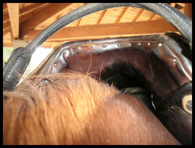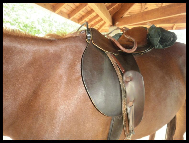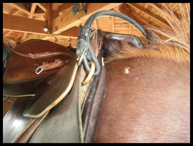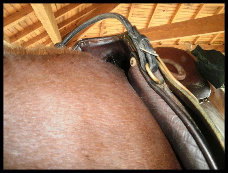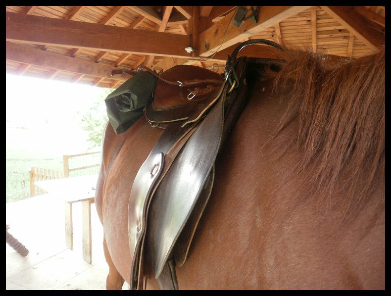 Bon, j'ai des photos...seulement, à peine j'ai mis le pied dehors: averse j'ai quand même sortie Queria du pré,mais j'ai fait les photos sous abri, du coup ça donne rien et puis je sais pas comment faire pour bien montrer comment tombe la selle je vous met ça, et au pire je vais en refaire.