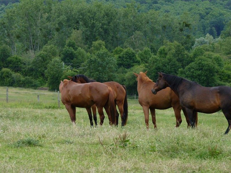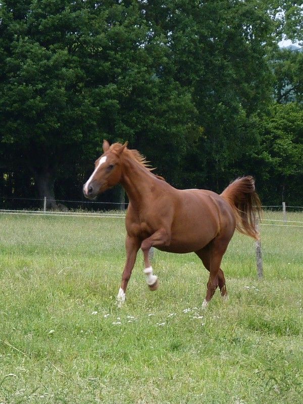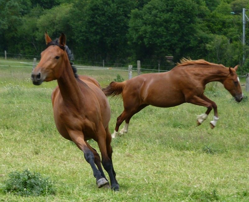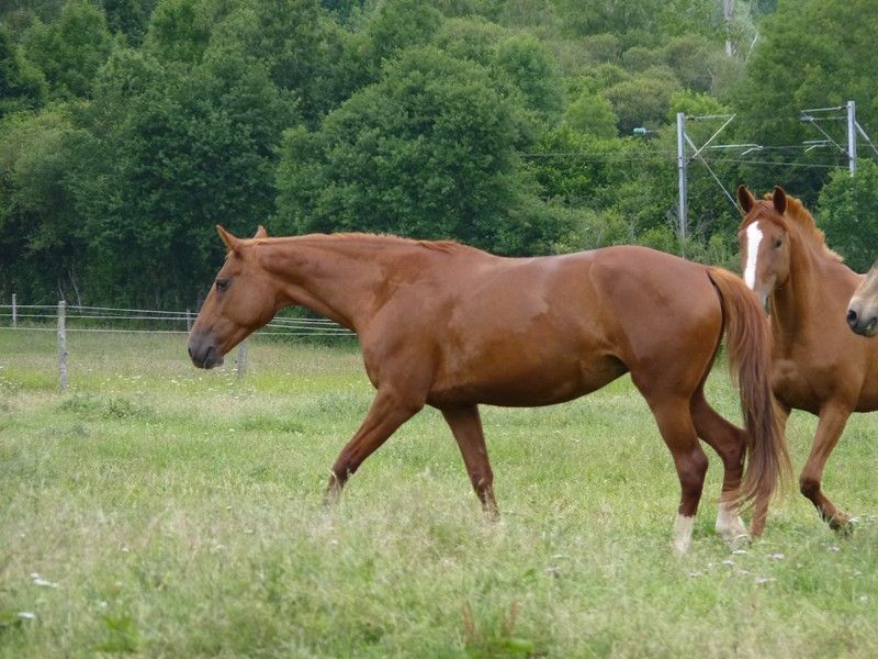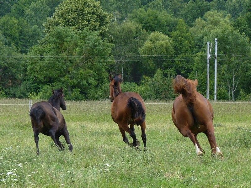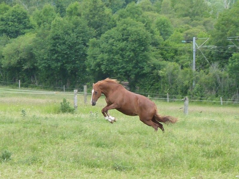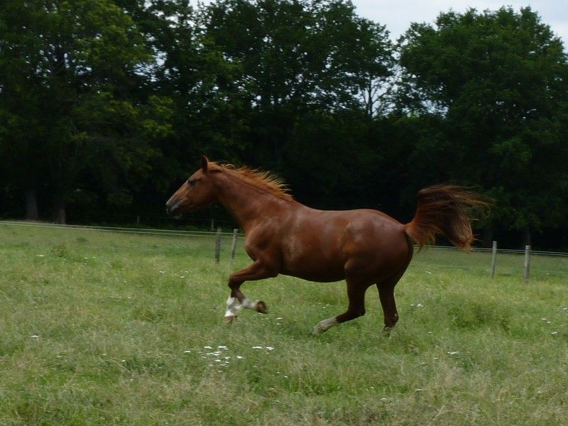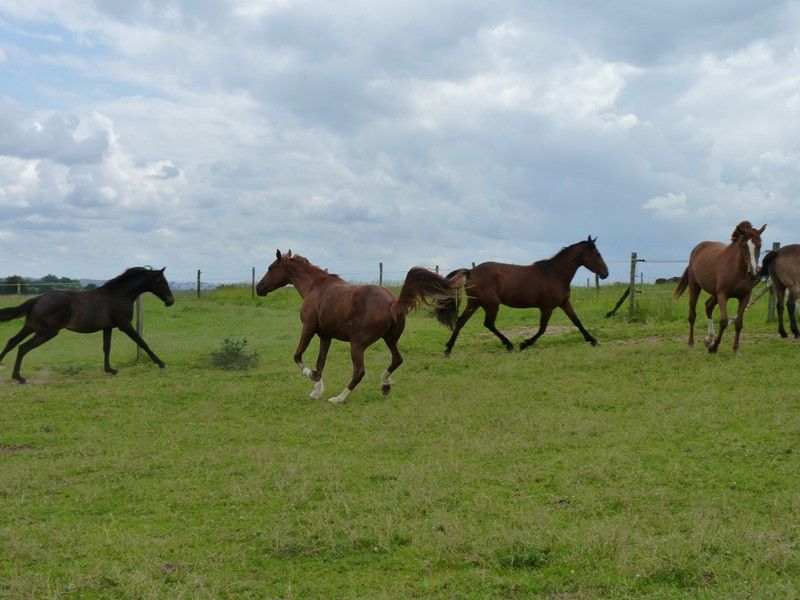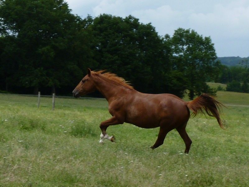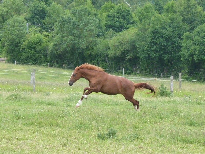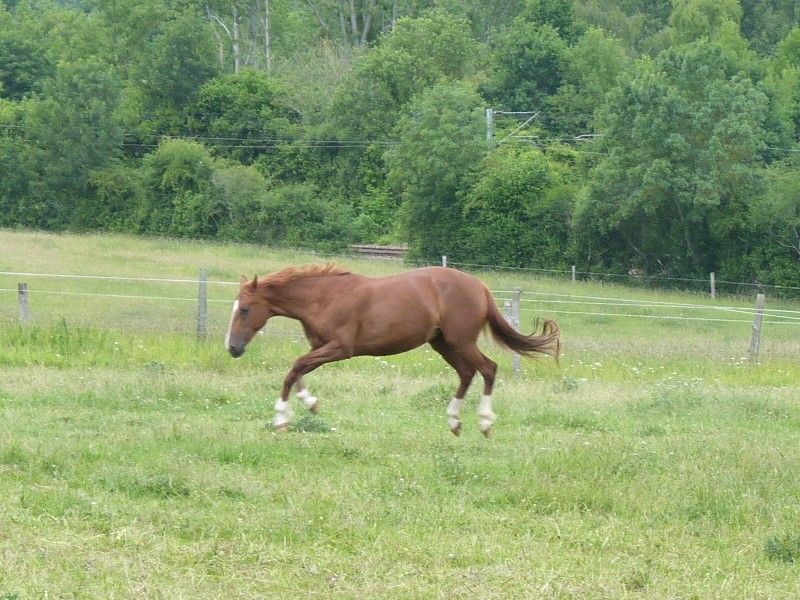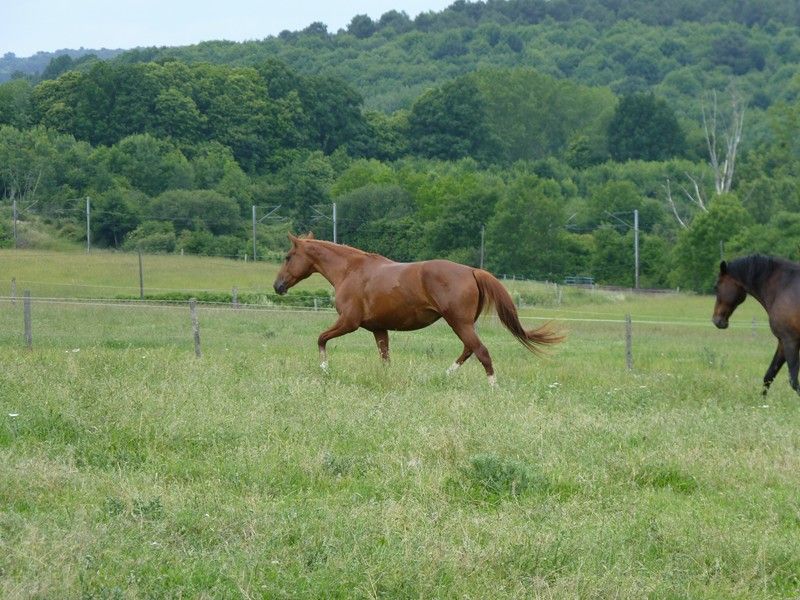 | Dire merci | *************** lundi 13 juin 2010 *************** Mes élèves étant en révision, j’ai ma semaine… ... j’en profite donc pour remettre Kirikou au travail puisque les croûtes ne sont pas [encore] revenues. Je ne crie pas victoire mais presque !Donc pansage rapide, pas de selle et zou 20 min de balade au pas à cru. La Grosse avait la pêche et voulait trotter mais je n’ai pas cédé ![]() Ensuite, avec Galeor on a décidé de la remettre en troupeau avec ses copines : Hégérie (la Folle), Talinn (ExtraSuperGlu), Toscane (SuperGlu), Velvet Moon (Poulichette) et Typhon (Typh’ l'étalon des plaines). Et là, ça a été festival ![]() Comme j’avais prévu le coup, j’ai plein de photos ![]() Message édité le 14/06/10 à 17:56 |