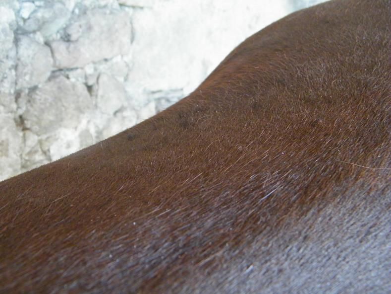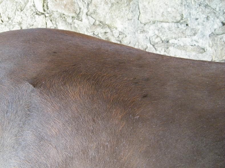 | Dire merci | Pour ce qui est des poils, ça repousse un peu, il y a des endroits (d'ailleurs c'est très moche) où des poils bais repoussent, et d'autres où il y a des jolies touffes de poils noirs!!! Ca donne un style particulier Je vais essayer de faire des tofs, mais je ne suis pas sûre que ça va bien ressortir... Des photos, des photos !!! |