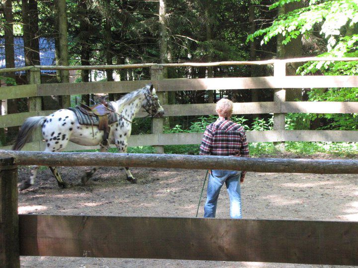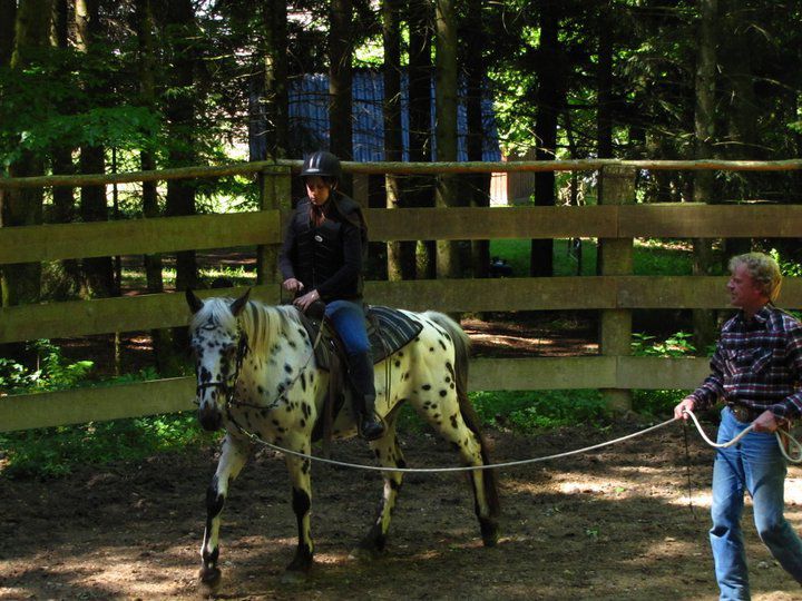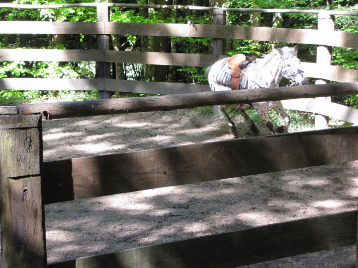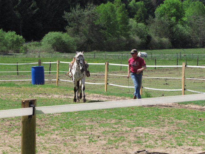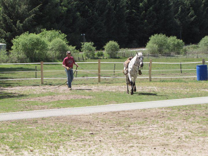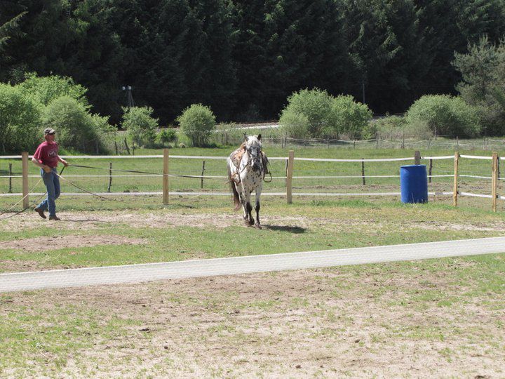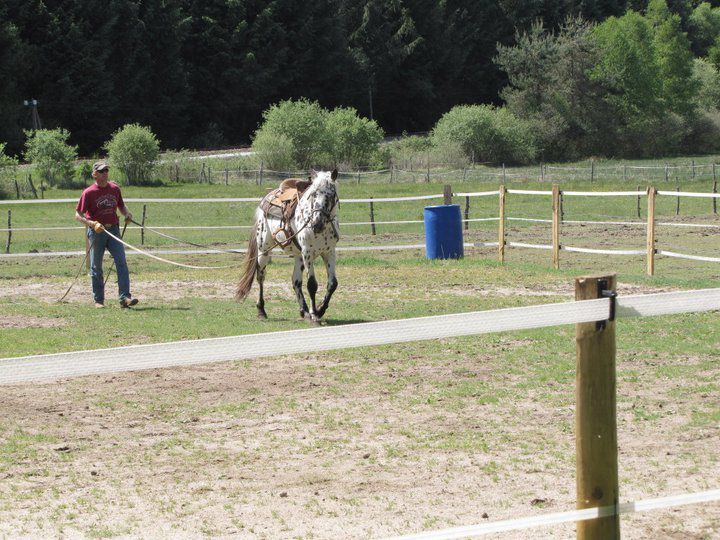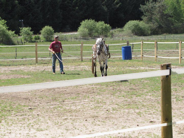| Dire merci | Changement de page, je remets les vidéos Juste pour montrer comme il recupere la connexion avec le poulain de 2 ans qui galopait un peu partout! Lien ca montre bien que niveau réactivité c'est pas top. mais c'est surtout moi qui ne suis pas assez reactive, j'aurais du lui faire un rappel de stick sur l'épaule dès le début. et puis je ne suis pas assez exigeante, Union fait els exos "comme ci comme ca" pour faire plaisir quoi! par contre niveau arrêt je le trouve bien, et il fait un pivot pas mal au début. bref je trouve que lui est bien, mais moi je dois me secouer Lien la il désengage bien et il est plus réactif, mais par contre l'arrêt est moins bon. mais surtout on voit le super cul en coeur de la grosse juju Lien dans le rond de longe, il est poussé s'il faute, et finalement il fini par se cadencer Lien désensibilisation Lien |