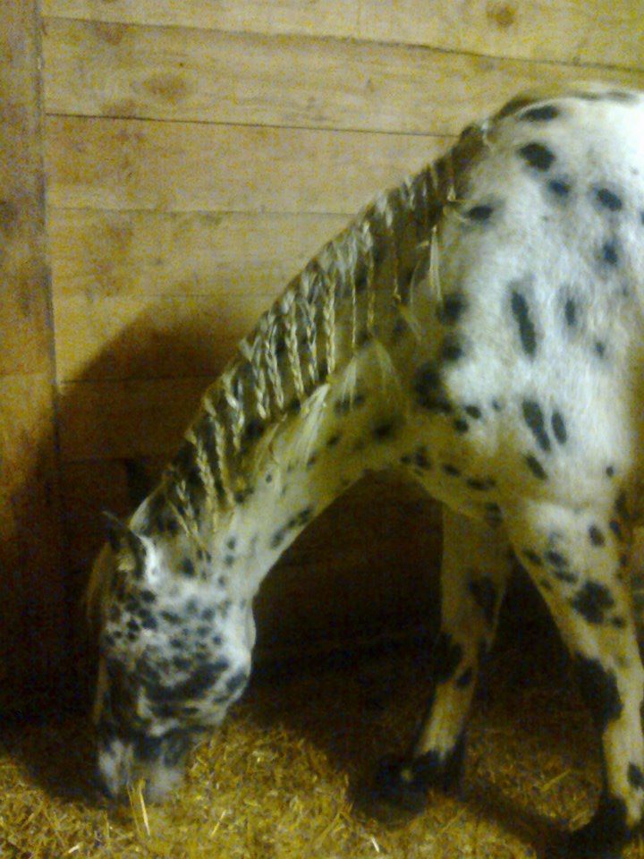 | Dire merci | Pas grand chose de nouveau en ce moment. Union est assez sympa en carrière, il bosse bien. le travail du moment c'est le travail sur 2 pistes. pas évident du tout, mais je pense qu'il commence a comprendre même si c'est pas évident de bien croiser les pattes arrière! en balade toujours pareil, il a la connerie au galop et préfère rester en tête. J'ai pas vraiment grand chose a lui reprocher ces derniers temps, il est assez gentil en plus, mais ne même temps pas de grandes avancées, on stagne un peu. A pied il s'est passé un truc étonnant, les chevaux sont vraiment mystérieux tout d'un coup un jour il n'a plus compris la demande du cabré, mais alors vraiment plus, et du coup ca lui mettait la pression de ne pas comprendre, il était tout inquiet et s'agitait. Grace a un pti bout de carotte il a compris de nouveau et-v le faisait bien. sauf que... il ne comprenait plus la demande de réculé de face!!! il croyait que c'était une demande de cabré!! pourtant j'avais l'impression que les demandes étaient bien distinctes mais apparemment pas assez! et ce qui est fou c'est que le reculé c'est un véritable acquis, comme donner les pied par ex!! mais bon pas grave on a enchainer reculé/cabré/reculé ect... et tout est rentré dans l'ordre! Sinon l'autre soir je glandais dans son box et l'idée m'est venue de lui faire des tresses pour voir si ca allait lui onduler la crinière! mais j'avais pas d'élastique donc ca s'est défait pendant la nuit (photos pourrie de portable) le soir ![]() le lendemain! ![]() |
