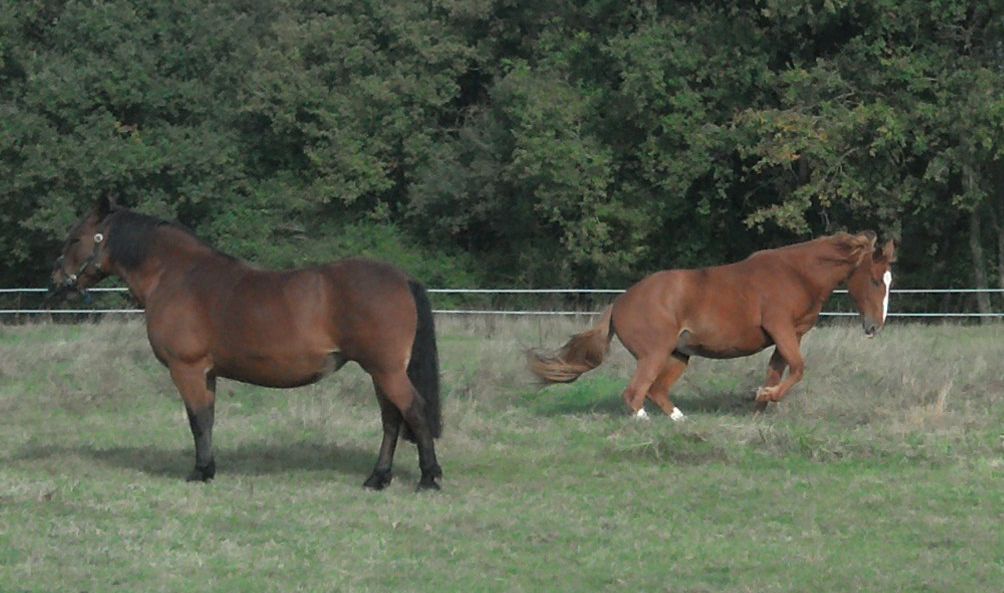 | Dire merci | Toujours été caractérielle, mais malheureusement çà ne s'arrange pas avec l'age. Elle ne veut plus travailler, dés qu'elle me voit elle n’approche plus la première, menace les autres alors qu'elle n'a jamais été dominante. Je pense que l'arrivée de 2 nouveaux voisins (hongres) l'a perturbée, elle est tout le temps en chaleurs et pourtant chasse méchamment les nouveaux, juste la clôture électrique entre les 2 parcs, et elle s'en prend des coup de jus... |