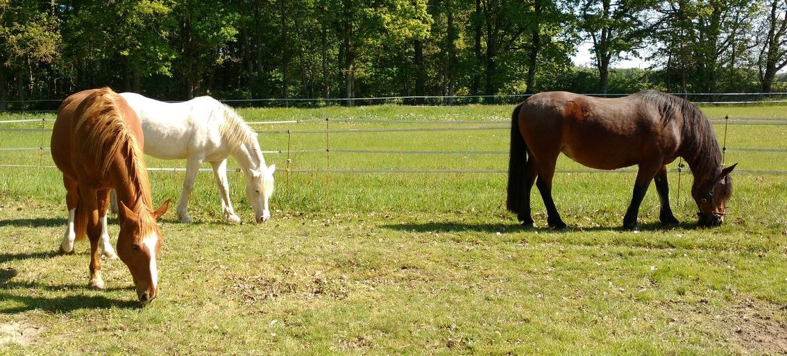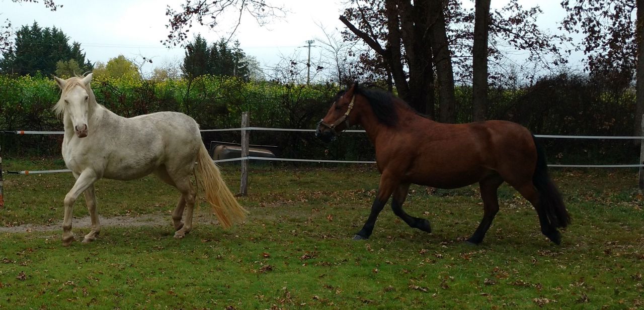 | Dire merci | Bonjour, quelques photos, plus d'un an sans venir, le temps passe tellement vite... Méribelle s'est pris un mauvais coup de pied de la part de sa copine Vallée à la mise au pré au mois d'avril. J'ai entendu un gros craquement lors du coup. Après avoir cru au pire, boiterie importante du postérieur droit alors qu'elle s'est pris le coup côté gauche, pas de fracture, le temps que l'ostéo passe elle s'est remise seule en moins de 2 semaines. Le véto, pas spécialiste équin, trouvait que c'était soit une fracture dans le sabot ou hanche/vertèbre(s) déplacé. Vallée boite toujours plus ou moins et Caline travaille de temps en temps. voilà pour les nouvelles. |