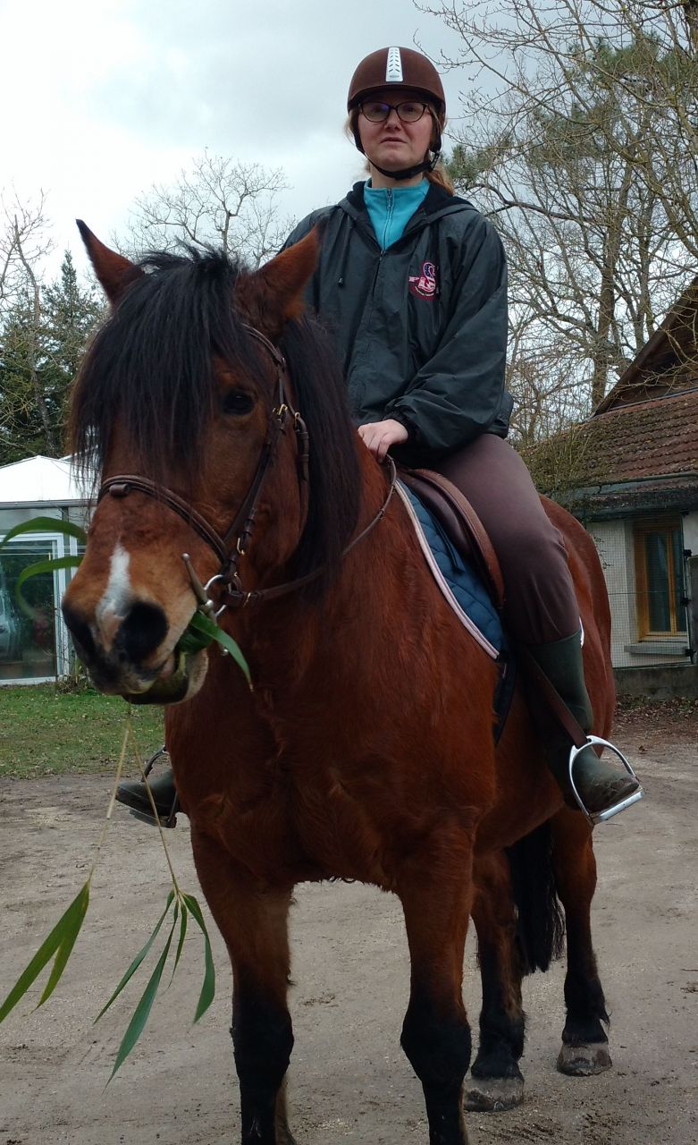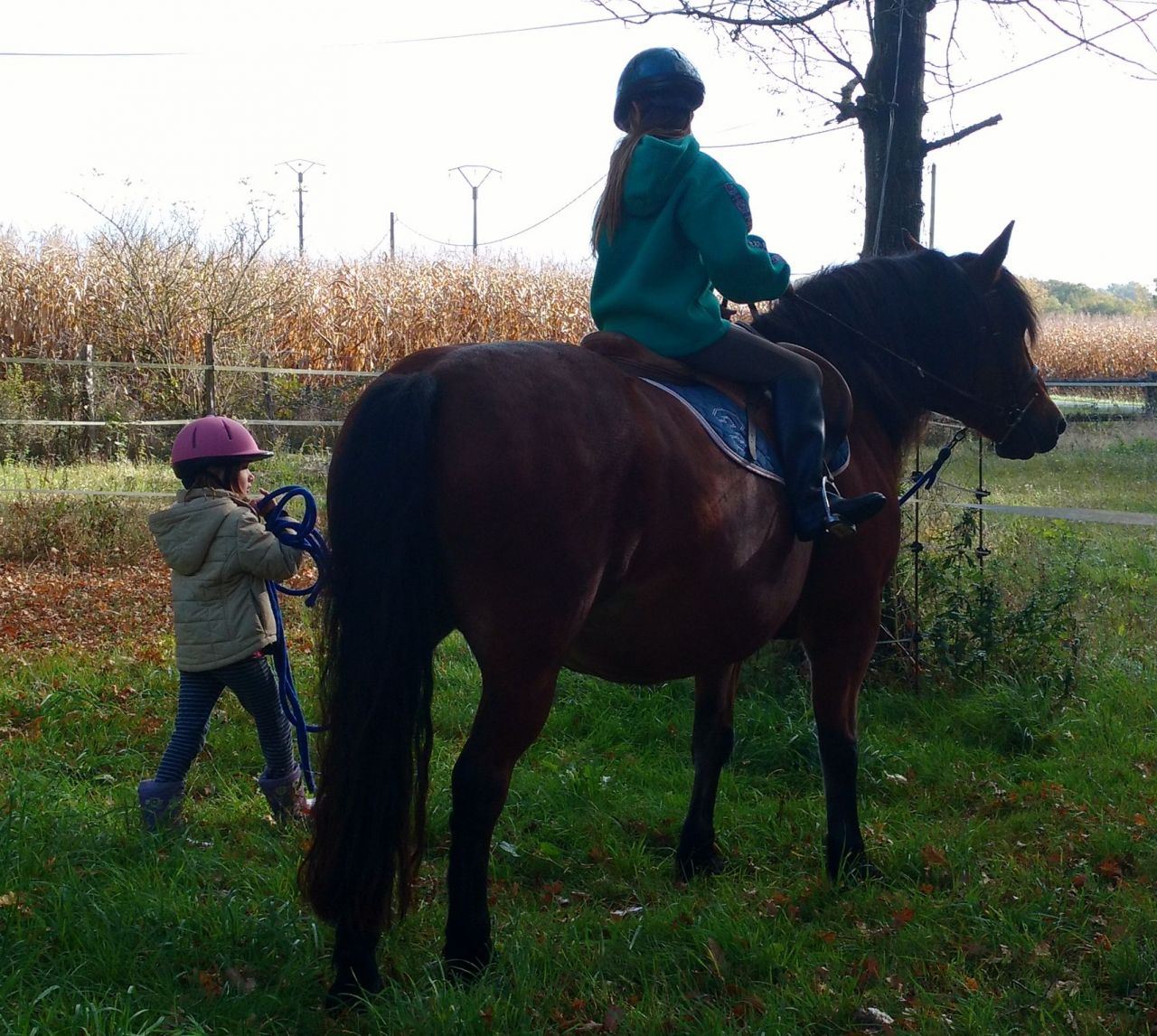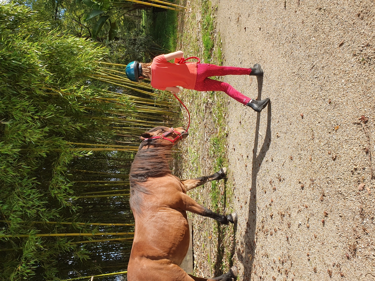 | Dire merci | balade en main elle aime si on ne s'éloigne pas trop des copines, en longe déconseillé par l'ostéo car trop d'appuis sur ses articulations déjà douloureuses, au longues rênes elle fait des demi-tour brusques et s'enroule dans les rênes... . sinon sa spécialité en longue c'est de menacer (dents et ruades) |