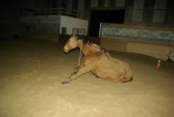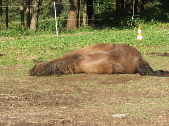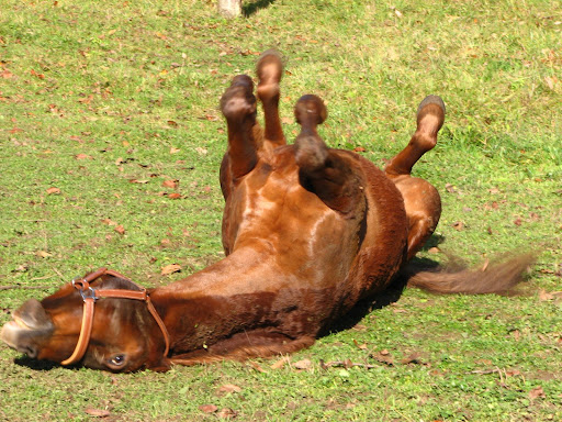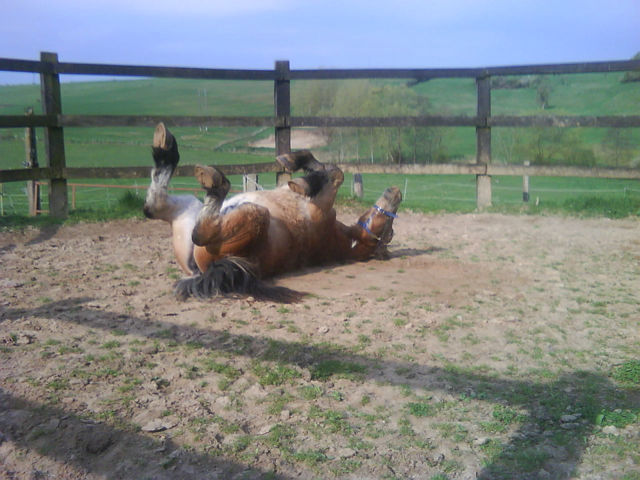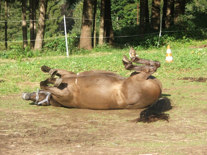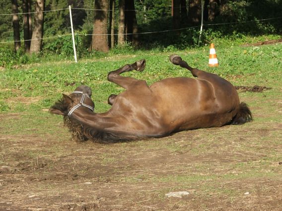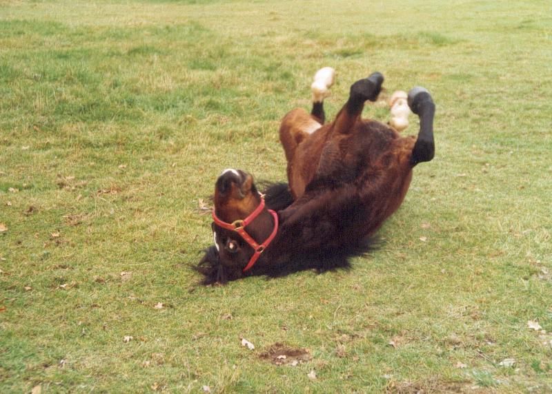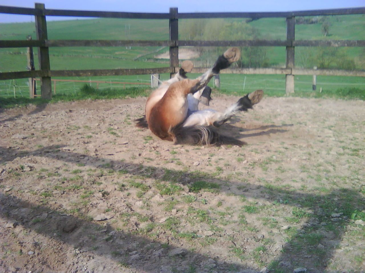 | Dire merci | autant avec vicky, les roulades sont rares, autant avec la jument de ma soeur, c'est hyper simple: sortez la au paddock, de préférence après l'avoir bien pomponnée (vous aviez en tête de prendre de jolies photos pour l'anniversaire de votre soeur...), mettez lui le beau licol en cuir tout neuf (le cadeau d'anniversaire...), laissez la une demi seconde sans surveillance...et PATATRA sale bête Vicky, comme dit, c'est plus dur: faut d'abord trouver un manège avec un sol bien souple, le faire bosser avant (sinon il a pas envie de se rouler), prier pour que les astres soient alignés, mais quand on arrive à réunir toutes les conditions, il s'en donne à coeur joie tout ça pour une superbe escalope panée ![]() |