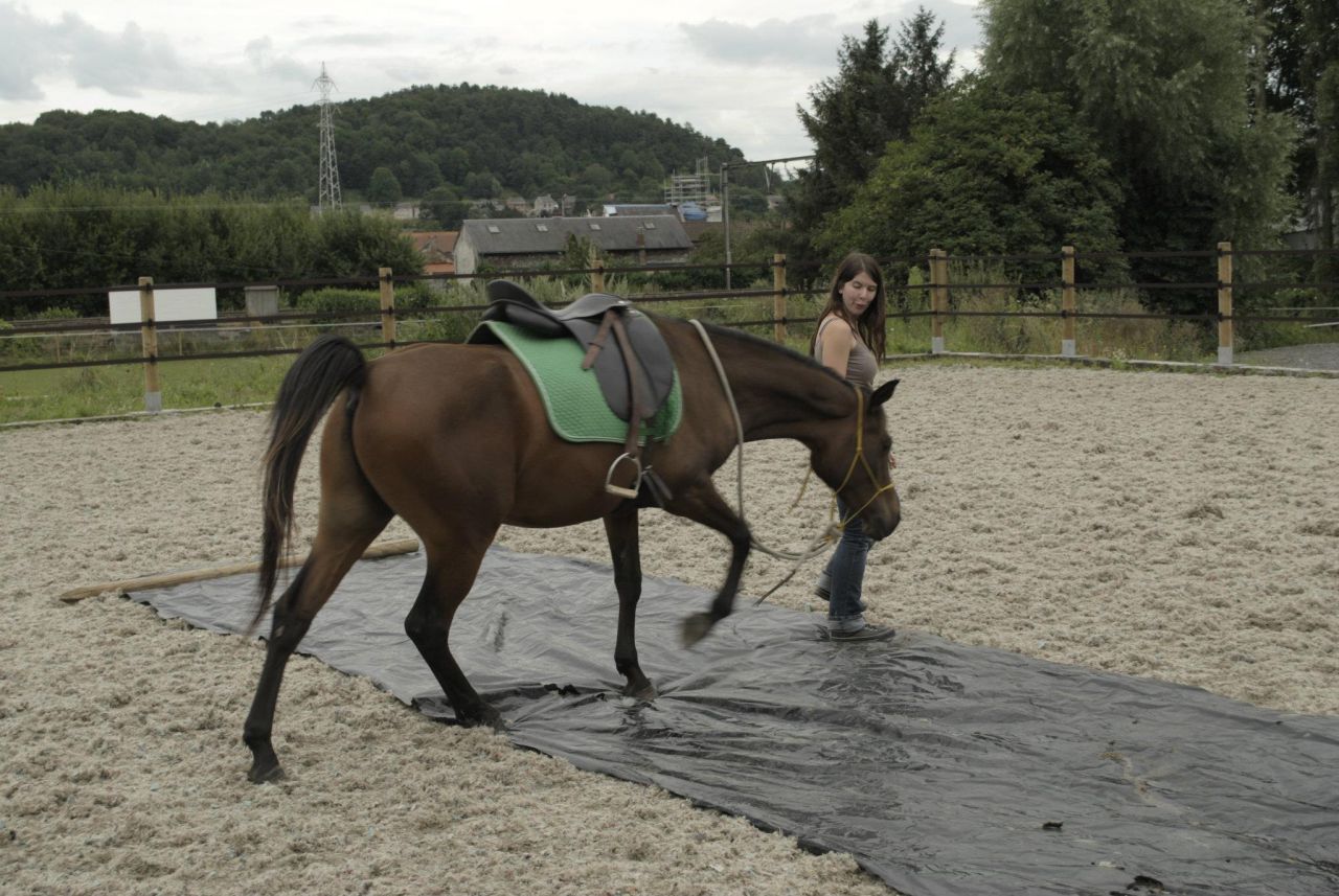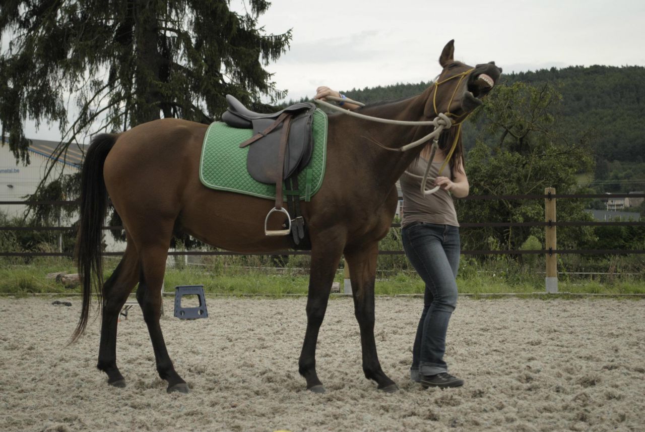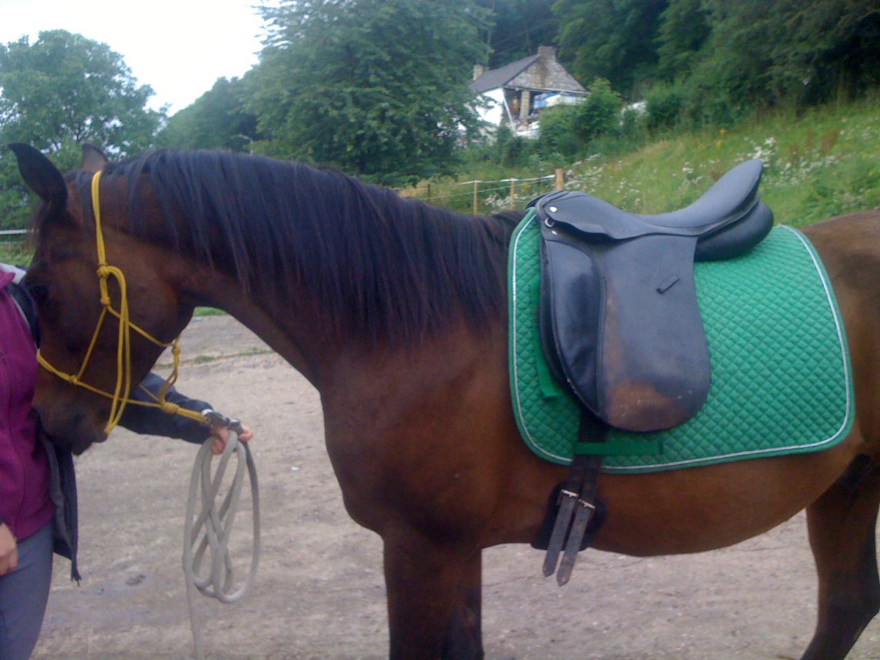| Dire merci | Et voilà, Eragon a été sellé pour la première fois aujourd'hui! Enfin, il avait déjà eu la selle posée sur le dos une fois il y a quelques semaines, mais ce coup ci, c'était pour du vrai, avec la sangle et tout! Il s'est très bien comporté! On a un peu marché au pas en piste, puis 3 ou 4 cercles au pas à chaque main. ![]() (photo iphone, prochaine séance j'emmène le reflex) |