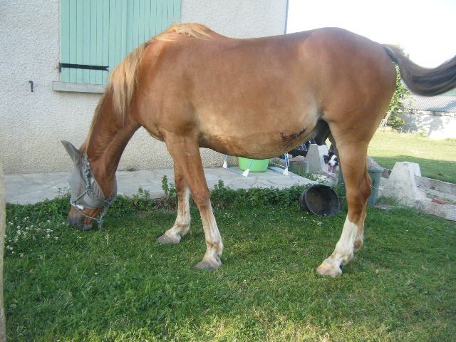 | Dire merci | Tout commence ce 28 septembre 2008 Fakir devient mien ... [url=https://www.1cheval.com/membre/services/photos/images/40334.jpg] ![]() [/url] ![]() Loulou arrive enfin chez moi. Tout va pour le mieu, un hiver passe le printemps commence mais Fakir est victime d'un "accident" : La taureau défonce la barrière, sort et ... [url=https://www.1cheval.com/membre/services/photos/images/40336.jpg] ![]() [/url] [url=https://www.1cheval.com/membre/services/photos/images/40337.jpg] ![]() [/url] Le véto arrive trois heures plus tard Fakir a eu de la "chance" si sa bléssure avait été a peine un peu plus profonde ... Il recommece peu a peu sa vie, il est de nouveau heureux. Heureux de ne plus avoir a travaillé ni a etre longé ! Une semaine a passé il recomence a trotter en liberté, dans quelques semaines si il va mieu on recommencera un peu a le longé ... Désolé pour le pavé que je vous ai laissé ![]() |