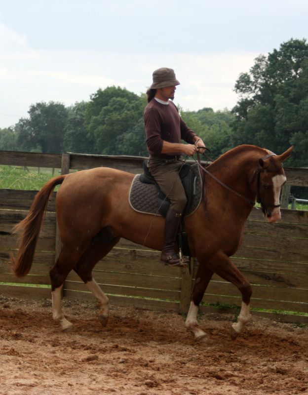 | merci beaucoup! nous avons choisi le produit d'un croisement judicieux des 2 lignées les plus massives de la race (les lignées dite"guerrière) afin d'avoir un cheval typé "Téké" (levretté, tête typique, yeux en amande terrifiant, élégance etc...) mais avec la "rondeur" d'un ibérique (on est fan de dressage et d'équitation espagnole); c'est l'arrière petit fils du triple médaillé olympique de dressage, Absent; ses parents sont élites et ce qui ne gâche rien c'est un alezan dun doré (dun rare et doré : 2% de la race contrairement aux mythes!) Il a 4 ans et c'est son dressage plutot que débourrage (1 an auparavant), précisément à la 5 ème semaine de travail |
