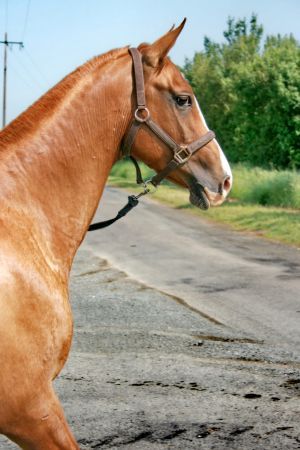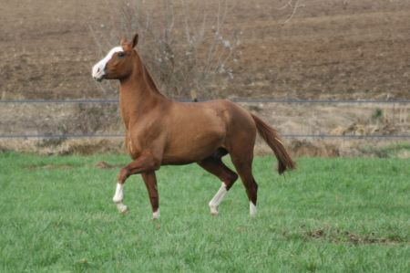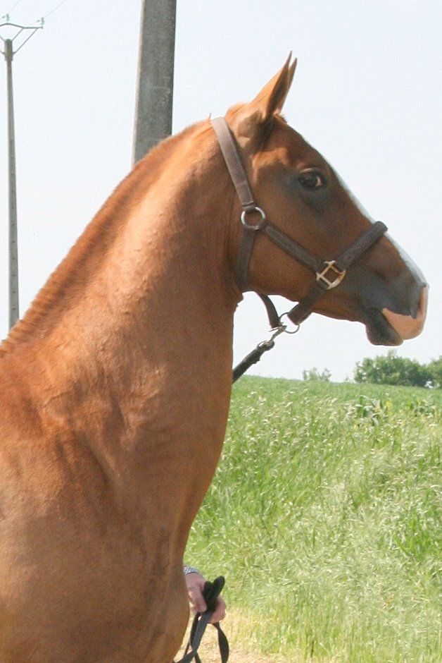 | pour en revenir au fait de s'encapuchonner, les tékés ont la particularité de trotter, ou même de marcher, avec la tête très droite, à la manière d'un serpent dressé; c'est dur plus dur de faire arrondir l'encolure et qu'ils se mettent bien sur la main en remontant leur dos; une fois appris, comme ils sont doués dans l'apprentissage et étant des chevaux plutôt souple, leur dressage peut atteindre des niveaux olympique : cas de l'arrière grand père du mien, triple médaillé aux jeux olympique en dressage; le père du mien fait du dressage et se place tout seul sur la main, trot en extension, passage, piaffer etc... avec ce quelque chose "d'ibérique", lui-même étant un cheval musculeux et plus en rondeur que la majorité des tékés Oui j'ai eu Riazan en France |