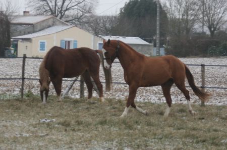 | merci! pour répondre à nonotte : Hélios, SF, fait 1m70 alors c'est vrai qu'à côté riazan avec ses 1m60, il fait tout petit , surtout qu'Hélios est très bien portant, il est Selle Français A, mais dès fois je me demande s'il a pas été coupé avec un comtois il est grand et méga costaud...je vous dit pour le seller ce que j'en ch...!mais c'est pas lui qui fait la loi....devinez! |