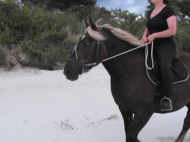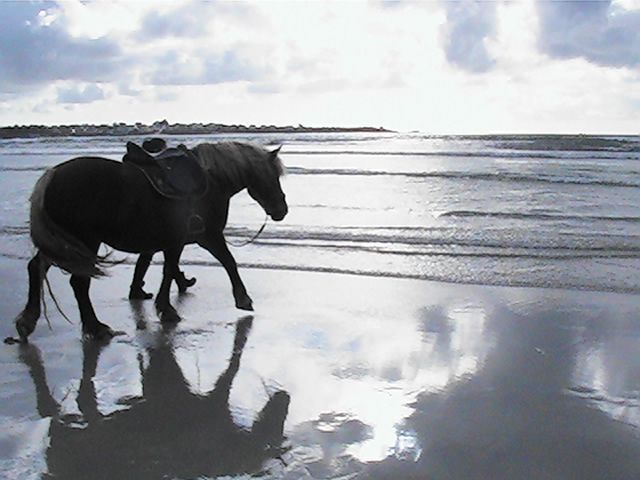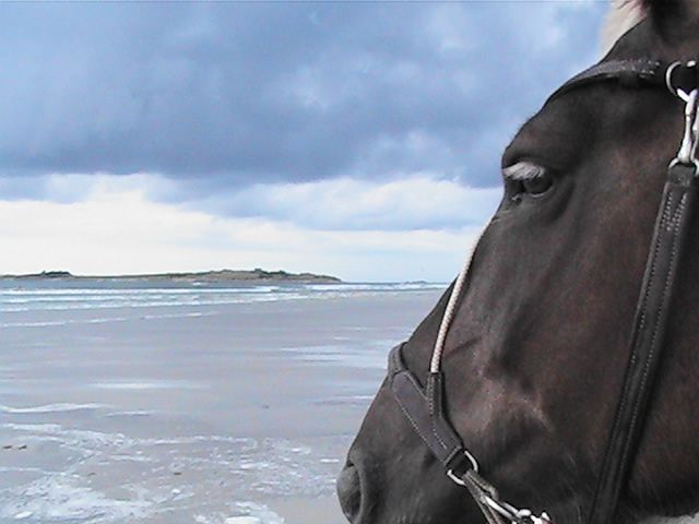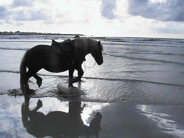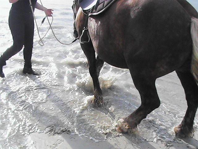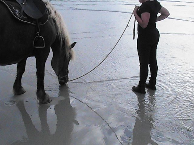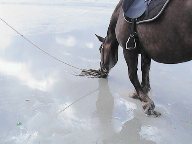 | Dire merci | je n'ai toujours pas testé le mors oui, les algues séchées surlesquelles il faut marcher, les trous dans le sable, les cerfs volants , ls gens qui restant fixer immobiles...Comme m'a dit Mikael, avec des pur sang d'entrainement au même endroit qui n'ont jamais vu la mer, encor dans la dune, juste quan ils ont vu sur la mer, et ils ne veulent déjà plus avancés, trop peur... Avec Ruby qui donne beaucoup, on a tendance à en vouloir de trop : rien que le trajet en van la stresse mine de rien : elle veut bien rentrer et tout, ne bouge pas, mais après le trajet aller et le trajet retour, elle était trempée, dégoulinante.... |