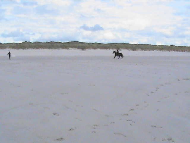 | Dire merci | n bah le mec à mon avis, l est pas pre^t d'approcher un cheval maintenant, en y repensant, j'aurais du descendre dès que je pouvais et aller le voir....mais bon...Je me demande si avec leur planche, Ruby ne leur trouvait pas une ressemblance avec des chevaux....mais du coup, je n'osais plus rester sur elle en allant vers du "monde" car j'avais peur qu'elle refasse la même chose...dommage, je n'ai pas pu vraiment profiter d'une folle galopade sur le sable praticable et tout le long de cette plage immense, mais bon, ca n'est que partie remise! |
