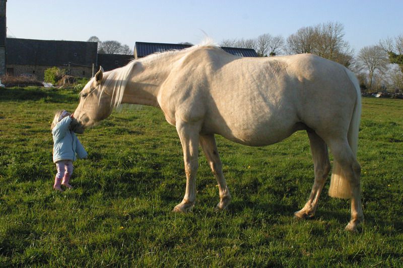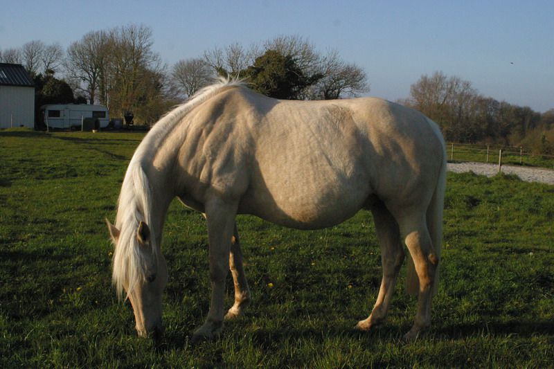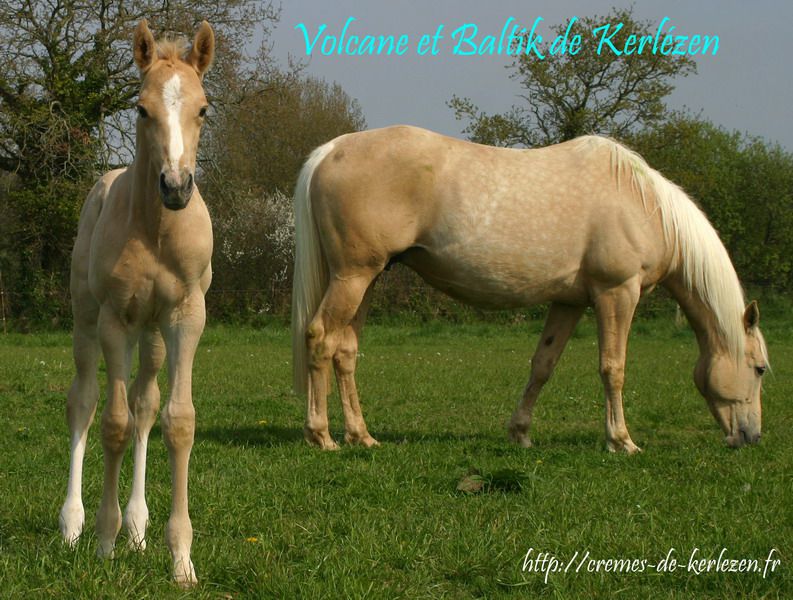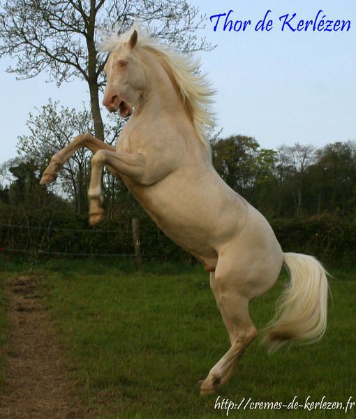 | Dire merci | Alors, à la naissance de la race crème en 1937 aux USA, il y avait 3 courants de sang autorisés: arabe, quarter horse et ibérique. Depuis les modèles tendent à s'harmoniser vers le standard de la race, qui est jeune en France (2005) officiellement, mais qui existe en france depuis 30 ans au moins, mais avant ils étaient OI avec des papiers américains de race crème sans valeur officielle en France. Je ne sais pas si je suis très claire, mais un beau race crème, qand on le voit on doit avoir envie de dire: c'est un race crème, sans avoir vraiment un courant de sang qui domine plus qu'un autre, c'est un mélange. Thor est un mélange correcte avec un peu de quarter par sa mère Volcane et un peu d'hispano arabe par son père Fun. Morenn a quand à elle du lusitanien par son père et du barbe arabe par sa mère. Merci à ceux qui ont tout lu! |