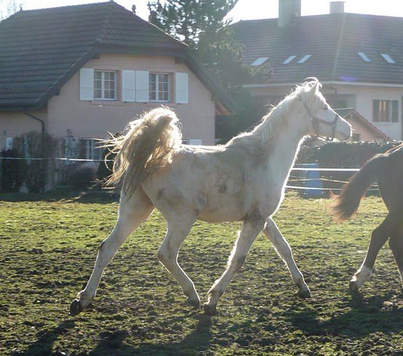 | Dire merci | Merci!!!!!![]() Oui il est superbe et en plus un caractère en or ! ! ! Il marche et trotte en main tout seul, donne les 4 pieds, il a mit le mors de sa maman, il a mis aussi sa chabraque, et la semaine passée on a été les promener un petit bout (la juju est tout juste débourrée) et c'est Fougan qui passait devant sa maman quand elle avait peur.....!!!! ![]() Et il a un de ces trots suspendu....!!! Quand il trotte a côté de nous on dirait qu'il est monté sur des ressorts.. faudrait que je fasse et que je mette une vidéo!! |