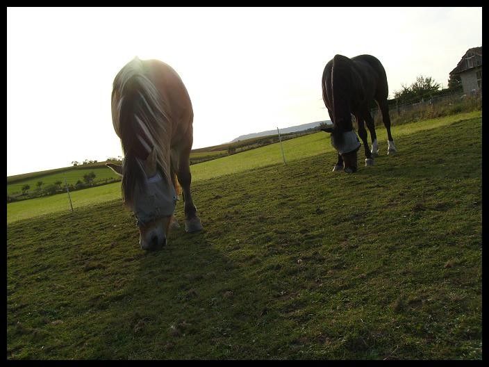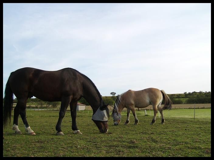 | Dire merci | Quelques photos qui datent du week-end dernier et que je n'avais pas eu le temps de poster:![]() ![]() ![]() ![]() ![]() ![]() Sinon les chaleurs de ma grosse ont l'air d'être parties. Enfin tout du moins je n'ai rien observé de spécial... Du coup elle est mordue à l'encolure et à la cuisse. J'espère que les morsures vont se "limiter" à cette période de chaleurs... Demain balade montée avec Indra et probablement promenade en main avec Champion. D'ailleurs l'autre jour je l'ai sorti du parc pour lui doucher les membres et lui faire un bain de javel, je l'ai éloigné jusqu'à la maison que l'on peut voir sur la 1ère photo en haut à gauche. Il ne voyait donc plus Indra. Et bien il y a du progrès!! Plus un seul hénissement, pas d'arrêt...bon la distance est minime mais c'est un début! Seule Indra continuait d'appeler! D'après ce que j'ai vu aujourd'hui rapidement il ne boite plus, je suis contente. Le parage lui a fait le plus grand bien! La suite demain pour plus de précisions! Message édité le 19/09/09 à 22:56 |