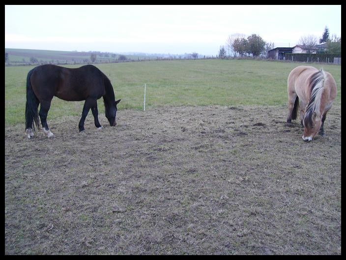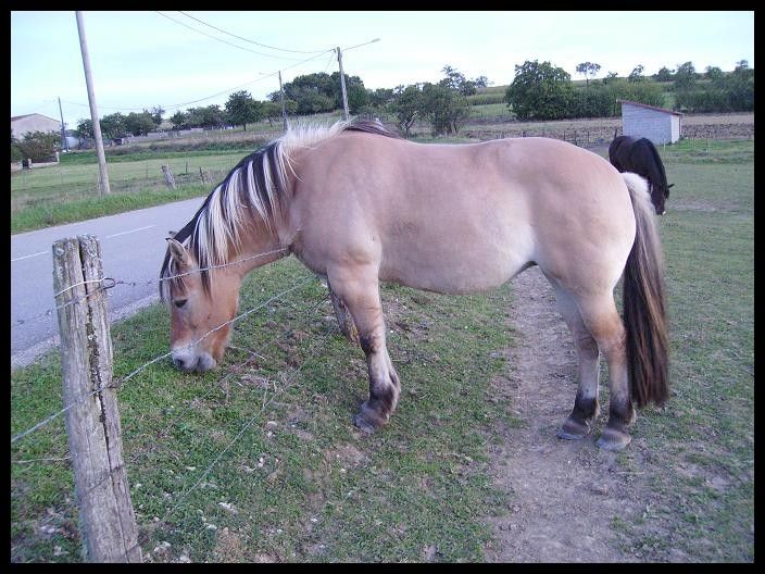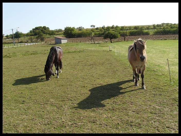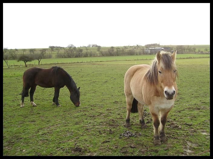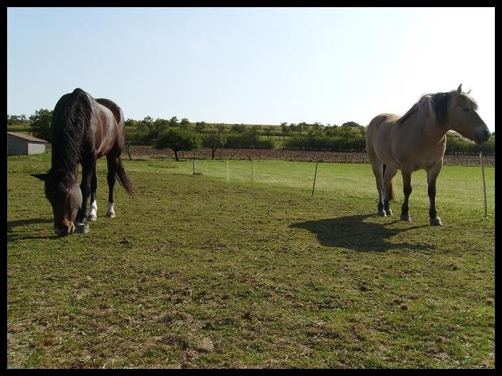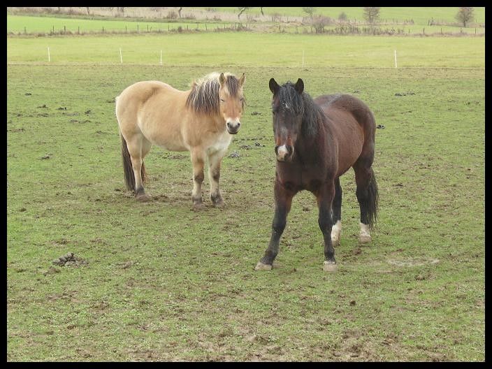 | Dire merci | Indra, jument Fjord, née en 1996 ------------------------ Champion, hongre OI né en 1997![]() Ayant ma boubouille depuis 10 ans bientôt, j'ai décidé de lui trouver un copain de pré, c'est tout de même plus agréable pour elle! Je me suis donc décidée, après quelques réflexions et grâce à l'aide de Ramdam, à aller visiter le Refuge de l'arche de Noé en Alsace! Et là j'ai trouvé mon bonheur! Un cheval beau comme un coeur, avec les mêmes caractéristiques qu'Indra (poids, alimentation...) Champion est donc arrivé chez moi aujourd'hui! Tout se passe très bien! Les deux s'entendent à merveille! J'ai hâte de le découvrir et hâte de pouvoir les observer tous les deux à long terme!! ![]() |
