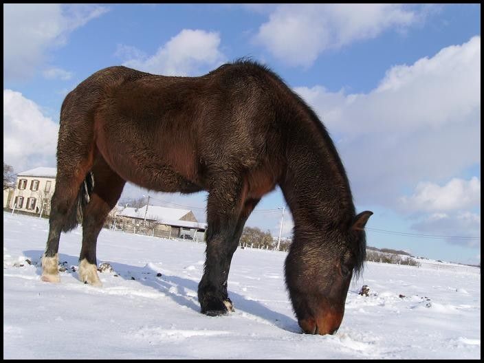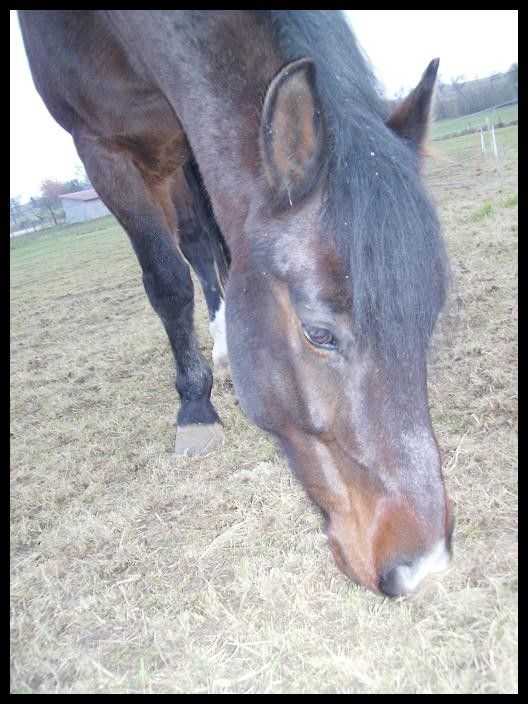 | Dire merci | Coucou tout le monde!! Désolé en ce moment je suis débordée tant au niveau scolaire que personnel...alors je n'ai guère le temps de donner des nouvelles... Indra va très bien. Le maréchal est passé mercredi et la voilà de nouveau déferrée pour l'hiver. Nous avons fait une balade Vendredi et elle le supporte toujours très bien. Pour Champion c'est une autre histoire...il a refais des abcès et n'était vraiment pas bien: couché toute la journée, boitant à patte cassée... La véto est tout d'abord passé et était sûre que pour lui ce cheval était fourbu. Petite cure d'anti-inflammatoires qui n'a strictement rien donné malheureusement...il passait ses journées couché.. Bref, le maréchal est venu et le diagnostic est finalement tombé: cheval fourbu des 4 pieds ce qui est apparement assez rare (mon maréchal n'a vu que 3 ou 4 cs comme ça dans toute sa carrière...), 3ème phalange basculée dans tous les pieds, soit un cheval immontable... Les pieds bourrés d'abcès, pourri...il souffre vraiment beaucoup. Mon maréchal a tout fait pour le soulager au maximum, mais bon cela reste presque vain... Je suis en même temps en colère et déçue. Déçue de ne pas pouvoir le monter, mais on va dire que c'est un moindre mal...mais surtout en colère par mon incompréhension de sa situation...comment les gens, ses anciens proprios, son pareur etc..ont-ils pu passer à côté d'une chose aussi évidente...alors que mon maréchal l'a vu aussitot en le regardant marcher et en regardant ses pieds...ça me laisse sans voix. Au final, le loulou est condamné à boiter à vie. Mais il tiendra compagnie à ma belle et sera bien traité, c'est le principal je pense.. |