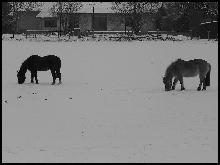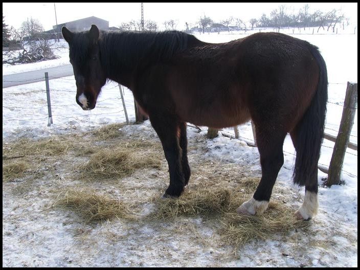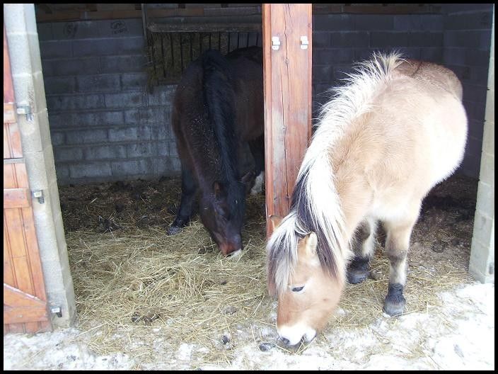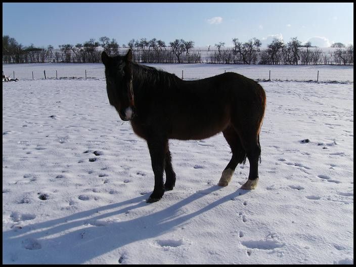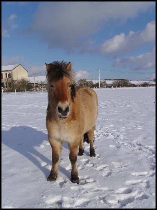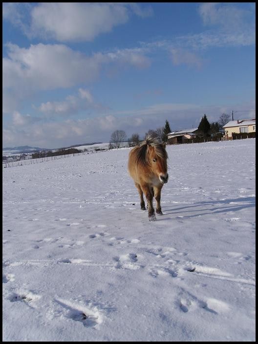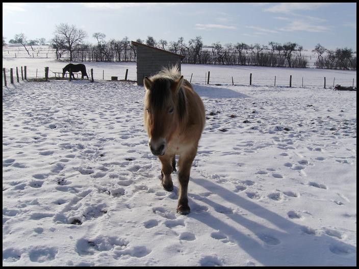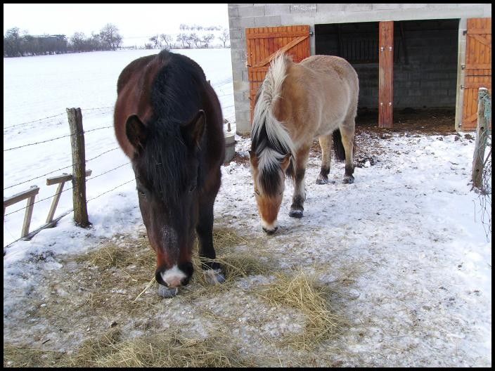 | Dire merci | Coucou tout le monde! Des nouvelles d'Indra et Champion qui sont dans un parc enneigé! ![]() Ils adorent ça! L'autre jour, il paraît qu'ils faisaient de belles cabrioles...dommage que je n'ai pas été là pour voir ça! Champion était une vrai peste hier. Il a senti les carottes dans ma poche, il voulait me monter dessus, baissait les oreilles...un vrai chieur quoi ![]() Je n'ai pas cédé tout de suite, mais bien après 5min, ça l'a bien embêté! Sauf qu'il a continué après même quand j'avais plus de carottes…du coup j'en ai un peu profité j'ai couru et il a trottiné un peu avec moi. Vivement que le beau temps revienne et que j'ai plus de temps à lui consacrer qu'on travaille un peu le respect... En attendant voici des photos: ![]() ![]() ![]() ![]() ![]() ![]() ![]() ![]() ![]() |