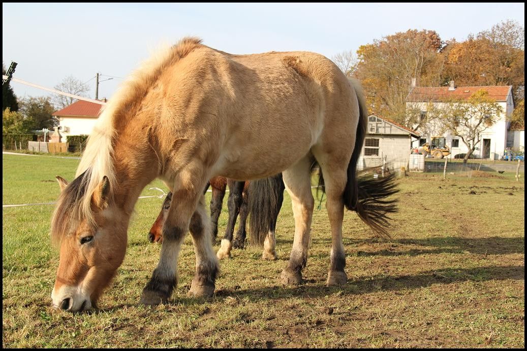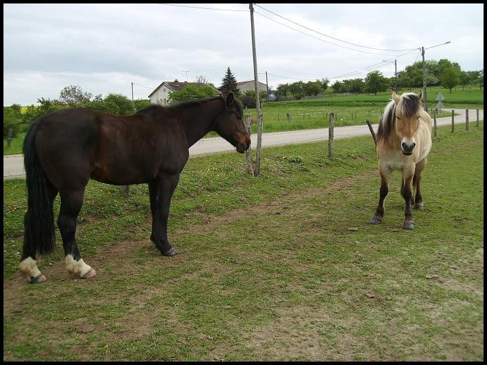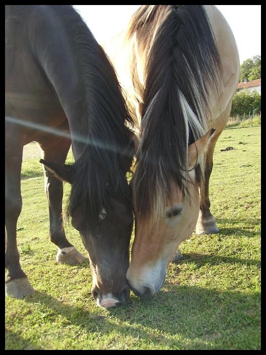 | Dire merci | Indra, jument Fjord, née en 1996 ------------------------ Champion, hongre OI né en 1997![]() Ayant ma boubouille depuis 10 ans bientôt, j'ai décidé de lui trouver un copain de pré, c'est tout de même plus agréable pour elle! Je me suis donc décidée, après quelques réflexions et grâce à l'aide de Ramdam, à aller visiter le Refuge de l'arche de Noé en Alsace! Et là j'ai trouvé mon bonheur! Un cheval beau comme un coeur, avec les mêmes caractéristiques qu'Indra (poids, alimentation...) Champion est donc arrivé chez moi aujourd'hui! Tout se passe très bien! Les deux s'entendent à merveille! J'ai hâte de le découvrir et hâte de pouvoir les observer tous les deux à long terme!! ![]() |