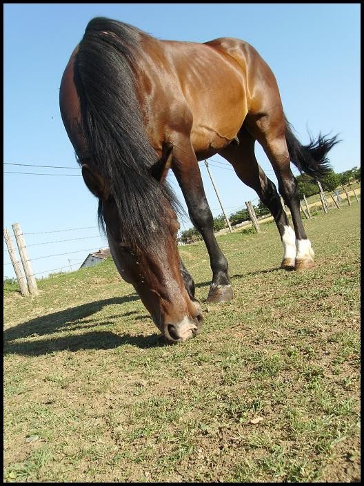 | Dire merci | Non c'est l'angle de la photo car sur celle d'avant il est pareil. J'essaye de le faire reprendre, il a plus à manger en ce moment. Mais je ne veux pas pousser le vis à lui donner du grain car là ça pourrait être la cata pour lui. Mon maréchal l'a vu comme ça il y a peu: il faut qu'il reprenne un ptit chouilla, quelques kilos, mais pas grand chose sinon ses pieds vont tout de suite en souffrir. J'ai hâte qu'il soit "guéri" pour que je puisse lui faire retrouver une ligne normale. |