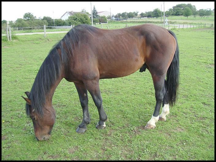 | Dire merci | Quelques photos, que je viens également de poster sur le forum des chevaux au régime, qui retracent l'évolution d'Indra. Recoucou à tous! J'ai trié des photos de ma jument qui retracent son évolution depuis quelques années, la différence est comment dire huuum, flagrante!! lol A son arrivée Décembre 1999 (vestiges de la tempête en arrière plan), elle avait 3 ans et demi ![]() 2000; quelques mois plus tard ![]() 2003 ![]() ![]() 2004 ![]() 2007, l'année où elle m'a fait sa plus grosse fourbure et où enfin j'ai trouvé un maréchal consciencieux et de bon conseil! On peut la voir avec des cloches au pré, Mademoiselle portait des fers orthopédiques ![]() ![]() ![]() ![]() 2008, ça commence à s'affiner: ![]() ![]() 2009, ça devient plutot pas mal ![]() Actuellement, à 14 ans ![]() |
