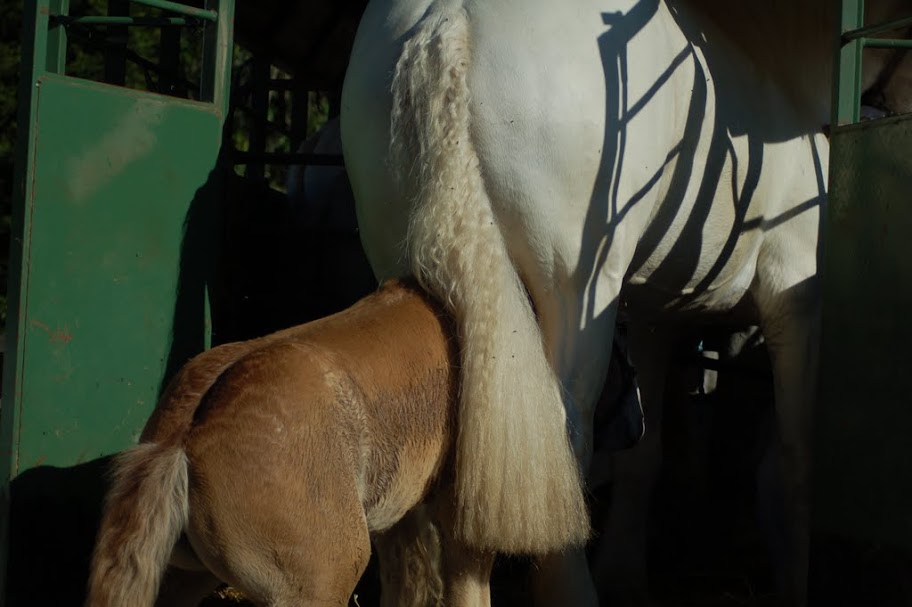 | Dire merci | c'est une pouliche en T de chez Debruyne qui arrêtait pas de faire la con. on peut encore faire plein d'autres choses: il marche sur le tronc avec les antérieurs, puis les postérieurs, puis les 4 membres... on a eu une jument avec un bébé né dans la nuit... Mention "bouhhh!" pour un mec avec une jument . Le poulain passait devant la jument, il le frappait fort et méchamment, c'était pas beau. Je sais que c'est des chevaux avec qui il faut être ferme, mais là, le pauvre bébé y comprenait rien. Je sais pas si elle se gratte ou si c'est autre chose, mais voilà le cul de la jument... |