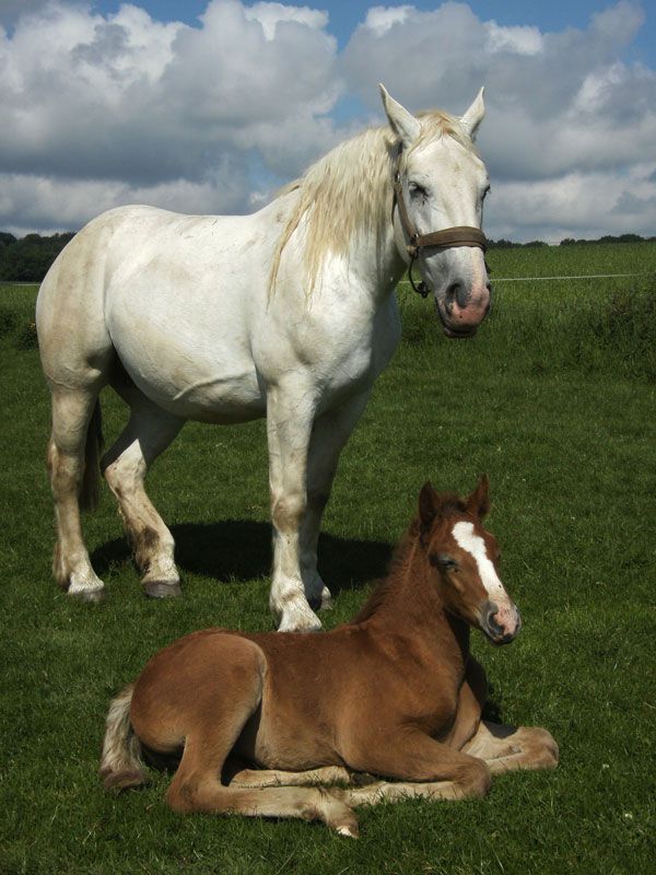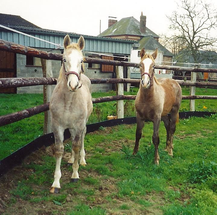| Dire merci | à 2 ans, ça n'était plus aussi évident, mais à 1 an l'ancien alezan avait encore conservé la composante "rose" dans la couleur du poil :![]() ![]() Mais désolée, Paquita, le plus beau, c'est Jonc ! à 2 ans, à 1 an, et à 7 mois (le plus foncé) :![]() à gauche, c'est Jackarro de Pippemont, le chouchou de Casimirus ![]() |