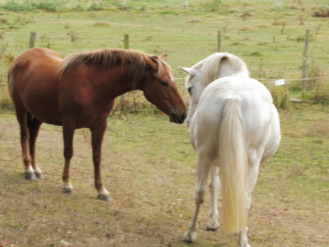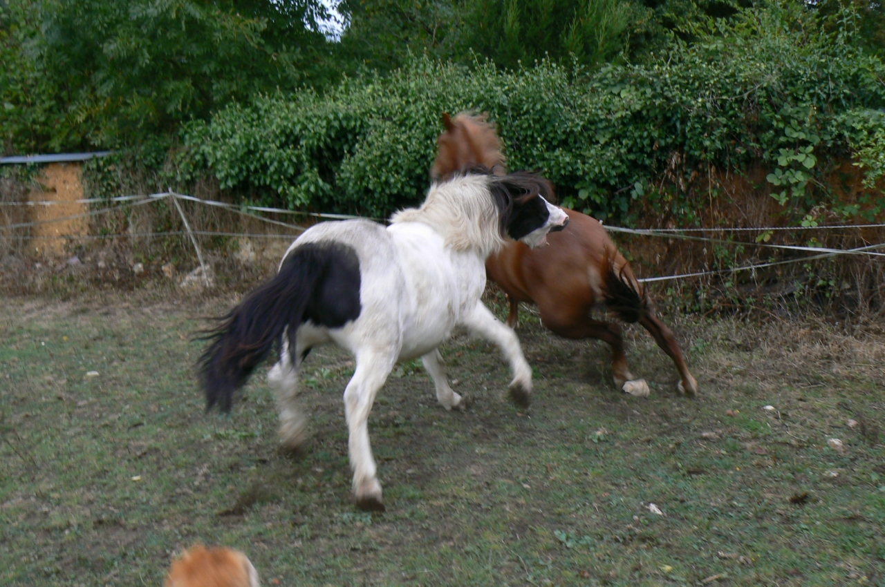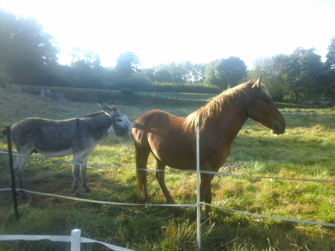 | Dire merci | bon les premiers émois passés, Apache n'est pas content du tout...![]() mais pas content du tout... il faut dire aussi qu'il n'y a pas grand chose à manger dans le pré et que je ne les supplemente pas parce que Maya et Apache sont trop gros... ![]() Apache était tellement peu aimable qu'Eclair a préféré passer chez le voisin où l'herbe est un peu plus haute... ![]() L'ambiance semble se détendre .... ![]() et ce matin, Eclair a fait dans la diplomatie en faisant un grooming d'amitié à Apache. ![]() Cela fait 10 jours que le grand poulain est arrivé et Maya est en chaleur. Elle vérifie que c'est bien un mec.... ![]() Et elle le colle lui faisant bien comprendre qu'elle était prête pour lui... ![]() Mais il fait semblant de ne pas comprendre... Message édité le 25/09/16 à 21:42 |