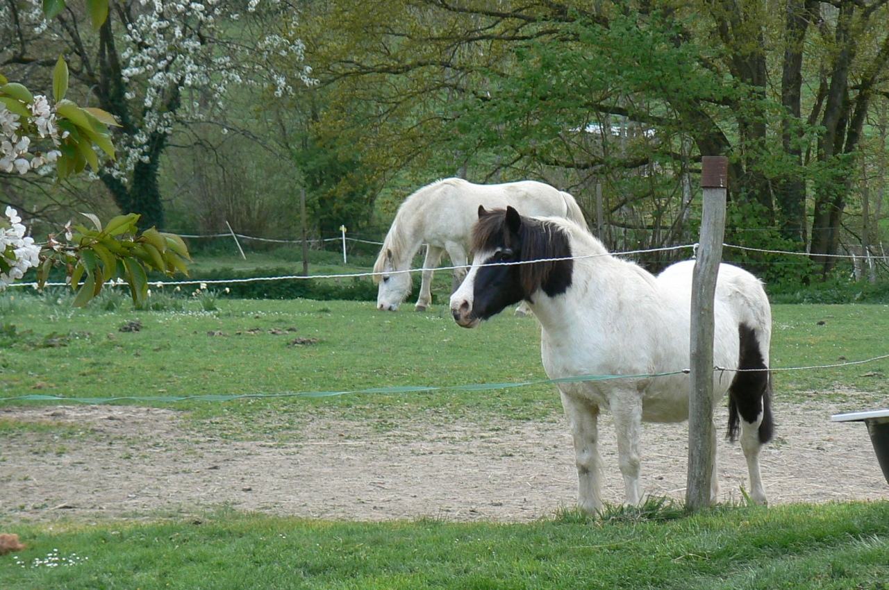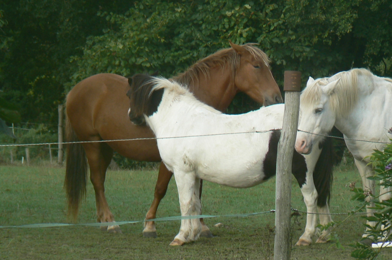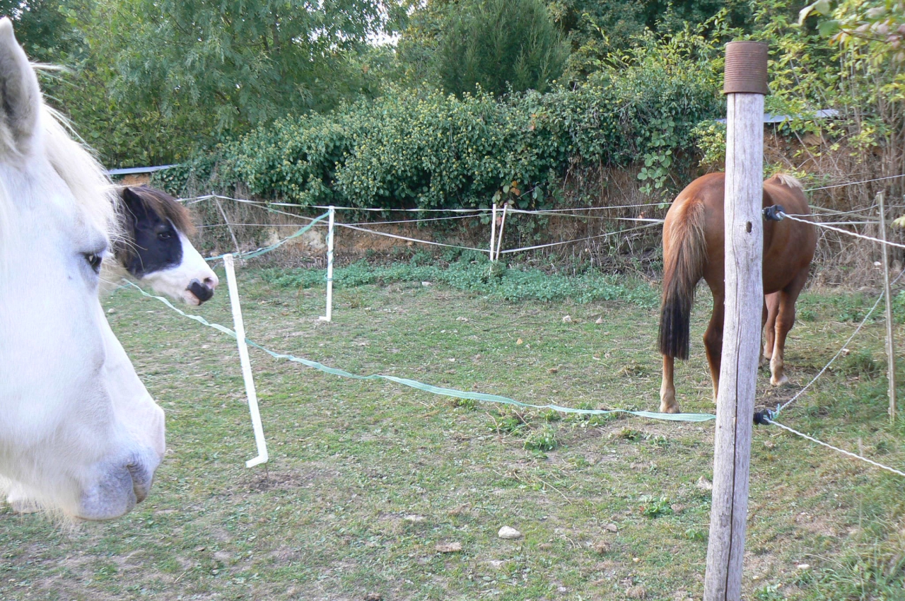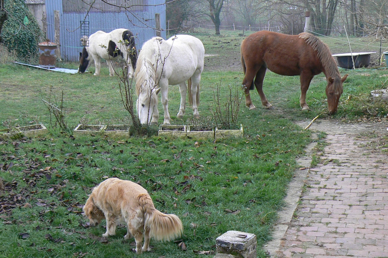 | Dire merci | oui, ouf comme tu dis horselover.. J'ai pu avoir une nouvelle parcelle. J'ai donc travaillé à refaire une cloture... L'âne à qui j'ai repris un morceau de son pré , n'était pas content... Il fallait que je sois sur mes gardes quand j'ai travaillé. Quand j'ai ouvert la parcelle, les 3 poneys ont été très contents. Surtout Maya et Eclair qui ont pu faire des aller - retour au galop, en veux-tu en voilà. Apache à cause de ses problèmes d'asthme évite de courir. Au bout d'une semaine la parcelle est quasiment mangée... mais malgré la saison, j'ai vu que dans les autres parties l'herbe ressemble moins à de la moquette. Les poons reviennent le midi pour manger un peu de foin... |