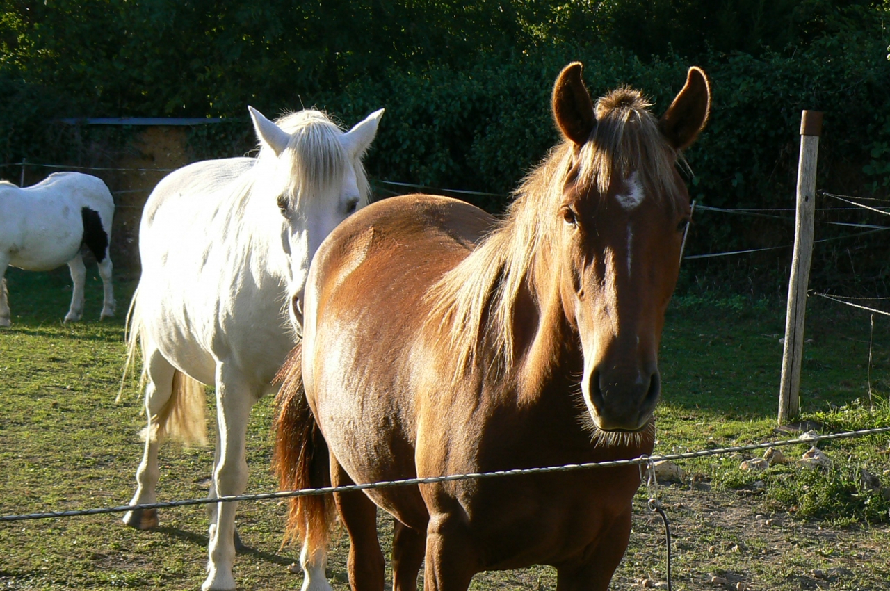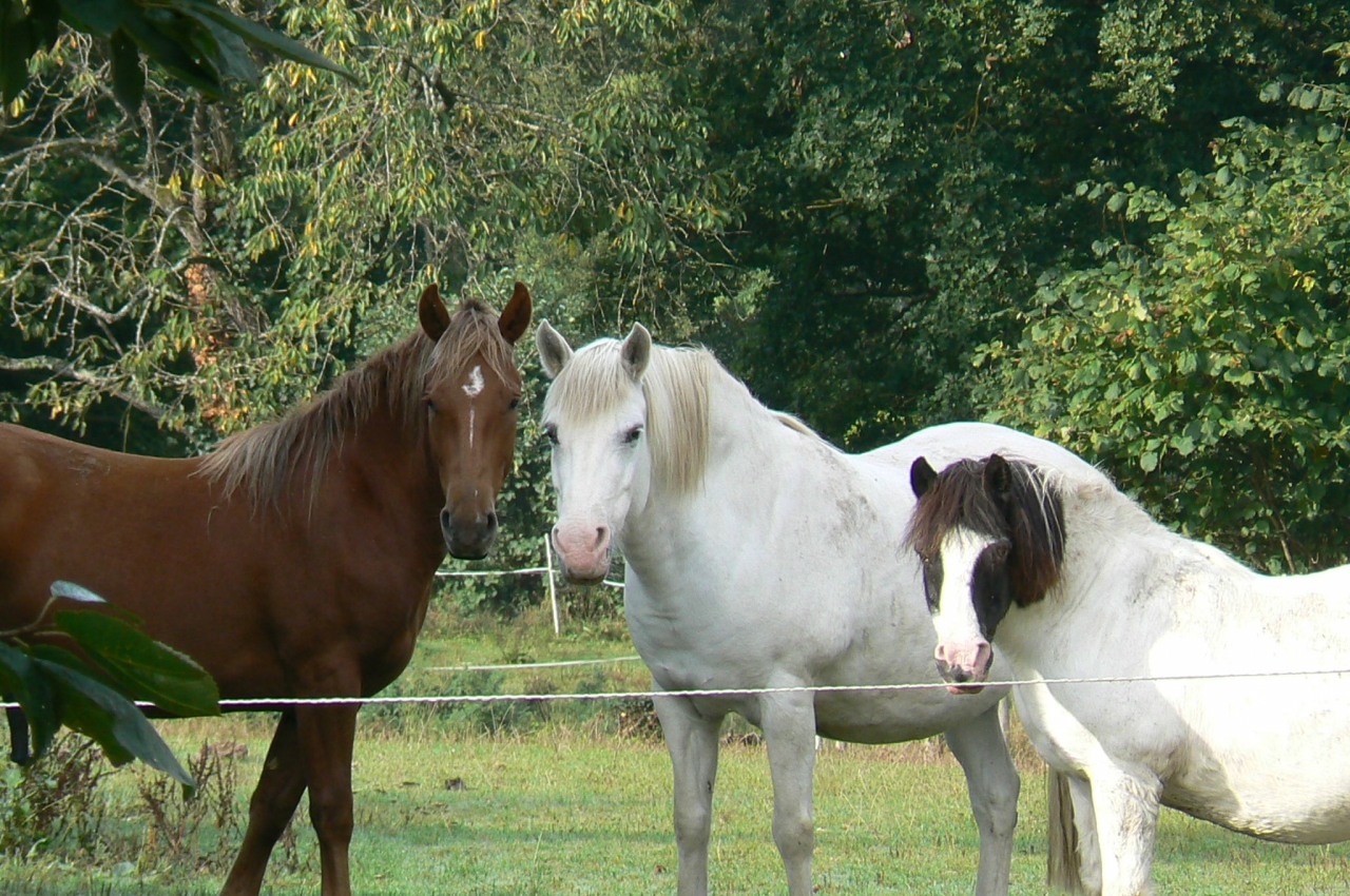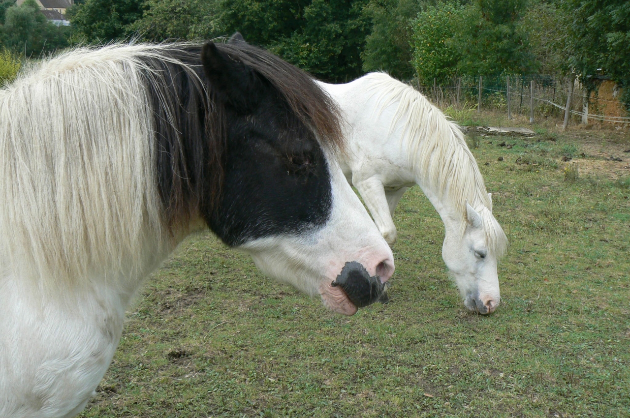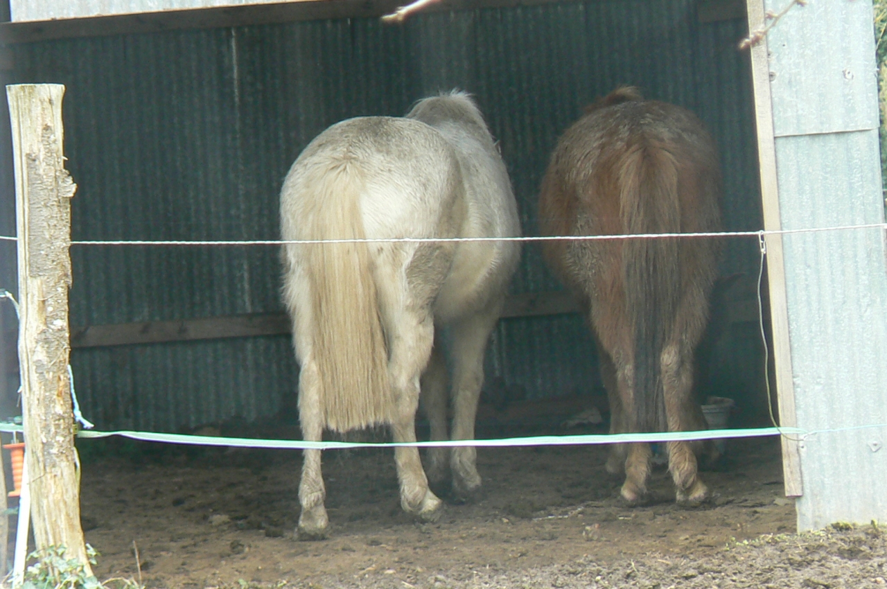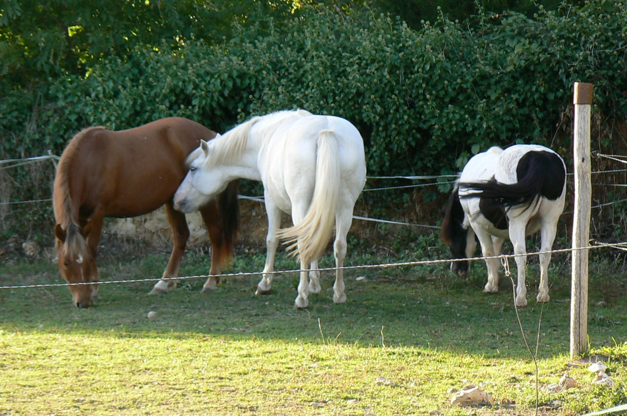 | Dire merci | oui, ouf comme tu dis horselover.. J'ai pu avoir une nouvelle parcelle. J'ai donc travaillé à refaire une cloture... L'âne à qui j'ai repris un morceau de son pré , n'était pas content... Il fallait que je sois sur mes gardes quand j'ai travaillé. Quand j'ai ouvert la parcelle, les 3 poneys ont été très contents. Surtout Maya et Eclair qui ont pu faire des aller - retour au galop, en veux-tu en voilà. Apache à cause de ses problèmes d'asthme évite de courir. Au bout d'une semaine la parcelle est quasiment mangée... mais malgré la saison, j'ai vu que dans les autres parties l'herbe ressemble moins à de la moquette. Les poons reviennent le midi pour manger un peu de foin... |