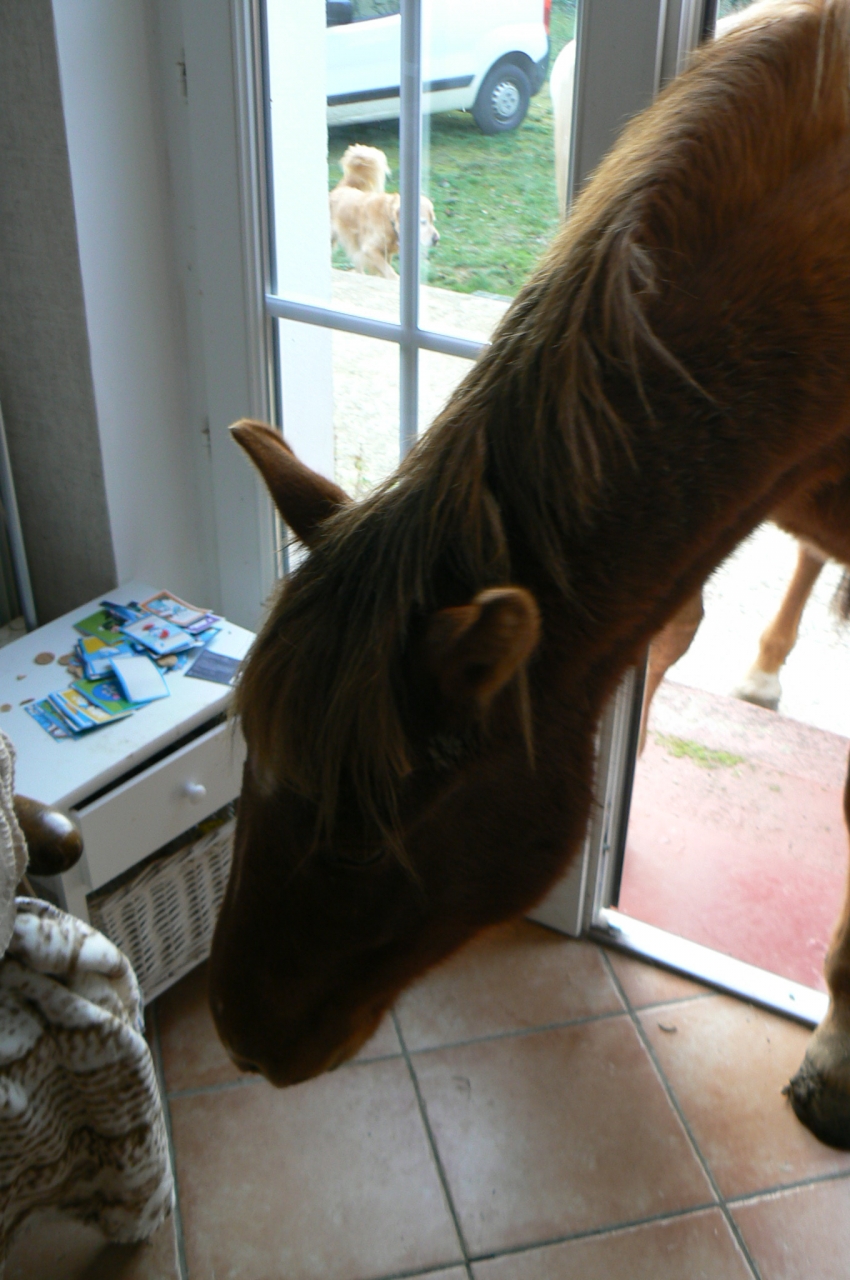 | Dire merci | Hier , les poons ont joué aux jardiniers dans ma cour. J'hésitais beaucoup parce que je craignais de ne pas réussir à faire retourner Eclair dans le pré. Comme il n'a pas plu en septembre et octobre et qu'ils sont trois , la surface qui m'est allouée ressemble à de la moquette tellement c'est rasé. Ils sont donc au foin depuis septembre, mais ce sont des petites portions pour éviter qu'Apache prennent trop de poids. En tout cas petites portions pour Eclair, ce que je leur donne est déjà trop important pour Apache qui a repris du poids depuis octobre. Bref, ils ont joué aux jardiniers ![]() Maya a même taillé mes rosiers... pour une fois qu'elle en avait le droit. ![]() Eclair a surtout tondu du côté de la sortie... il devait espérer que le portail s'ouvrirait tout seul pour partir de là.... ![]() Et puis il a fait quelque chose que Maya et Apache n'ont jamais fait, mais qu'Ukraine faisait : il est monté sur la terrasse... ![]() gros curieux... c'est un bien un bébé pour faire ça... ![]() Sur la terrasse , il m'a laissé une carte de visite par deux fois...puis il est parti s'enfoncer dans un petit coin. ![]() Inquiète que j'étais . Comment allait-il sortir de là..... et puis j'ai vu les cordes à linge... et là ça a été panique à bord pour moi.... calmement je suis allée le voir pour le sortir de là. J'ai soulevé une des cordes à linge et je l'ai fait reculer doucement.... ouf... Moi qui me demandait comment lui apprendre le reculer.... ![]() J'en ai profité pour lui curer les pieds. C'est un travail que je fais régulièrement car il n'est pas toujours coopératif. Mais il fait des progrès, cela s'est bien passé. Et j'ai voulu le rentrer dans le pré .... Il a sorti les freins, mais j'ai sorti les carottes.... et ouf... il est rentré sans trop de mal. Cela aurait pu être pire. Puis j'ai rentré Maya et Apache sans problème. Quand je leur ai donné leur foin, Monsieur Eclair a fait des histoires. Après avoir mangé de la bonne herbe verte, mon foin mouillé ne lui disait plus rien du tout. Il avait tout étalé partout dans son mini paddock.... pfff... Message édité le 05/12/16 à 21:12 |