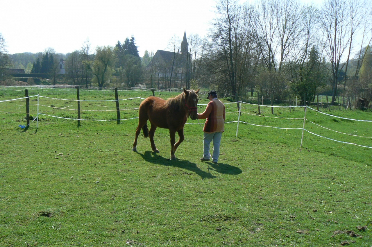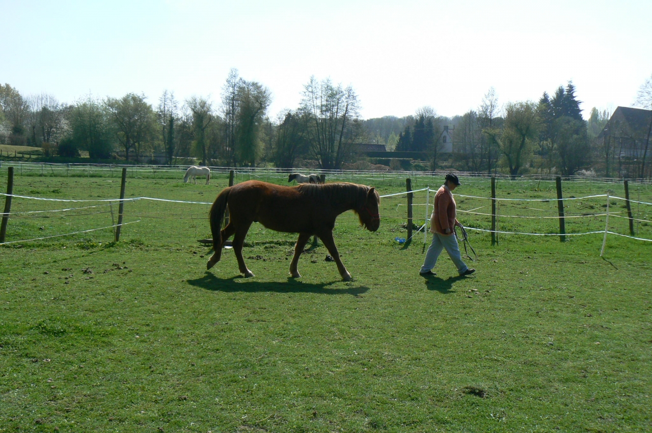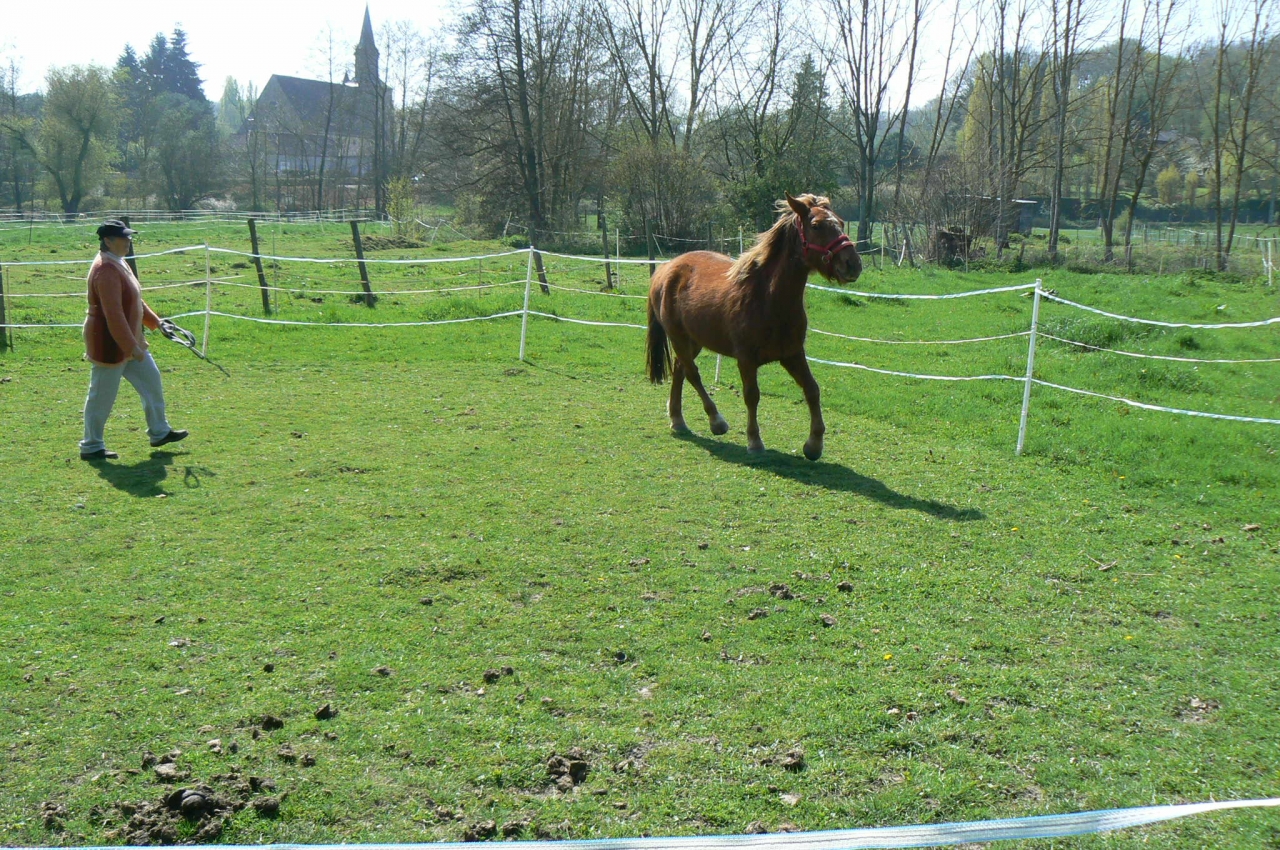 | Dire merci | Donc des petites nouvelles..... Au mois de mars , j'ai commencé le travail avec Eclair. Il faisait toujours le difficile pour rentrer dans le pré. A l'automne , je vous avez raconté mes débuts de travail avec Maya et Apache...donc cette fois-ci c'est à Eclair de s'y coller d'autant qu'il devait partir en formation en avril. J'ai commencé par trois séances de join-up seules. Ont suivie les séances de "yoyo" (tu recules puis tu avances.) La première séance , il a mis les freins en avant et en arrière donc cela a été un peu difficile. Il n'a pas du tout aimé le licol de dressage. Est-ce à cause du travail yoyo ou du foin dont les brins sont très longs (entre 1m et 1,20m pour certains) mais 4 jours après il avait une colique. Heureusement , la véto était prévue puisque que Maya avait toussé et qu'il coulait un peu du nez. Donc la véto est venue pour une colique et non pas pour un rhume. Le dimanche comme il allait beaucoup mieux, je l'ai remis au travail. Join-up. Yoyo. Mais j'ai trouvé que le yoyo n'était pas bon, alors je l'ai renvoyé sur le cercle. Il n'a pas été content. J'ai eu droit à plusieurs coups de culs. En veux-tu en voilà... Join -up et re - yoyo. Cette fois-ci le yoyo était correct. J'ai voulu travailler la rentrée dans le pré qui posait des problèmes. Je coince Maya et Apache dans une autre partie du pré pour pouvoir travailler tranquillement avec Eclair. Je sors du pré en laissant la porte grande ouverte et quand je veux revenir dans le pré. Il met les freins... "non, je n'irai pas"...sauf qu'il avait le licol de dressage sur la tête. J'ai attaché la longé à un des anneaux de dressage et marche arrière. OK. marche avant NON. Donc il a fallu me fâcher un peu puis j'ai réussi à le rentrer , moi étant en marche arrière, m'arrêtant tous les trois pas pour le caresser sur le front sans tirer sur la longe. ouf ! J'enlève son licol pour le libérer, il se serre contre moi et PAF il me marche sur le pied avant de partir..... Heureusement pour moi, j'avais mis mes chaussures à bout coqué. Malheureusement pour lui, car je lui ai couru après en l'engueulant... Fin du travail, il a rejoint ses copains. |