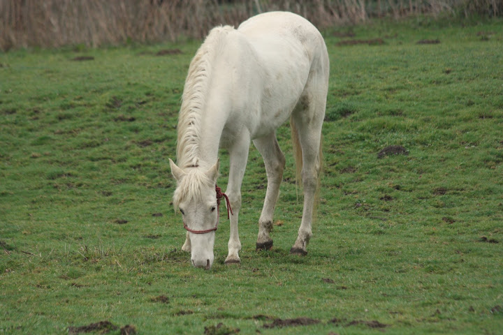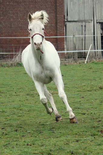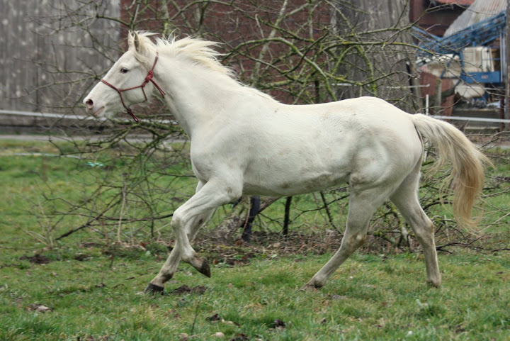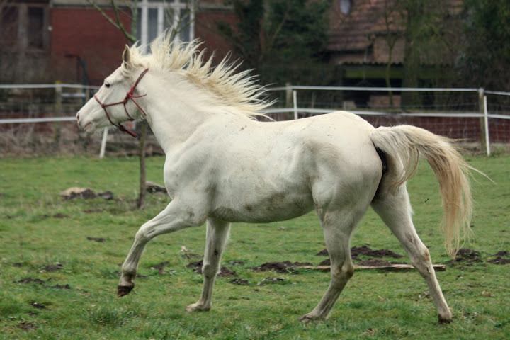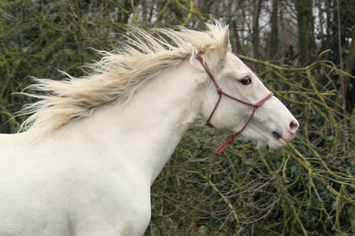 | Dire merci | elle est pie palomino overo à la base (très marquée de blanc) .... mais son palomino est tellement clair qu'elle fait toute blanche ... ![]() |