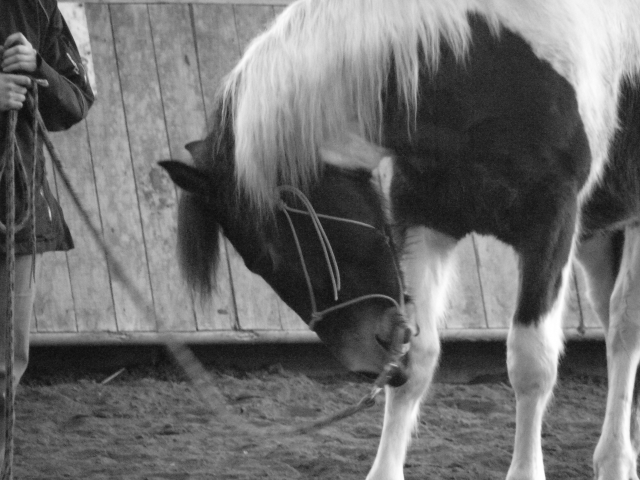 Déconnecté | Après pendant le stage, j'avoue je me suis un peu ennuyé, et je pense que Vaya aussi. En fait, on aurait pas du s'inscrire à ce niveau là (degré 1). En fait le prof reprenait exactement les mêmes choses que sur les DVD que j'ai à la maison. (mais bon, l'aprem était pas pour nous non plus vu qu'elle n'est pas débourré). Enfin, j'ai quand même pu me rendre compte que ce niveau là était bien acquis et je vais essayer de travailler tout ça encore plus en finesse. Mais bon je suis déjà bien dans les clous. (je craignais un peu de pas faire tout correctement vu que je bosse uniquement seule, mais finalement c'était plutot bon). Il faudrait aussi que je bosse sur la patience et l'indépendance vis à vis de moi, histoire qu'elle reste tranquille même si je ne m'occupe pas d'elle. Parce que ça par contre ça na pas été son fort pendant toute la matinée dans le manège... Dès qu'on était arrêter pendant qu'il nous montrait l'exercice suivant, Vaya restait arrêter 5 min puis elle essayait d'aller voir à droite et à gauche ce qui se passait, manger mes lacets de chaussure, mettre son nez dans mes cheveux, dans le sable, grignoter les barres..... bref, une vrai réaction de bébé pas patient ... Après pendant qu'on mangeait le midi et en début d'aprem (pendant qu'on regardait ceux du stage suivant) je l'avais mis dans un paddock. Ca s'est plutôt bien passé. Elle était un peu perdue au début, puis avec un copain à côté ça c'est bien passé. Par contre elle n'a pas tellement touché à son foin. Je crois qu'elle a pas encore bien compris qu'on pouvait manger le foin qui était dans le filet Avant de partir on est aller faire un ptit tour dans la carrière, sauter les contres hauts et contres bas. Ca l'a vraiment éclater!!! Et puis on a embarquer tout le monde. Elle était ravie de retrouver les copains à la maison, et sa botte de foin ! ![]() Enfin, pour nous c'est une très bonne expérience ! Je pense qu'on va continuer un peu sur cette lancer de travail à pied, on va continuer à se dépatouiller avec les DVD et à faire au feeling comme je l'ai fait jusqu'à présent puisque visiblement ça marche plutôt bien. |