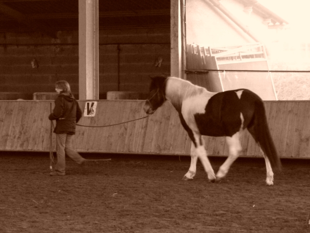 Déconnecté | Aujourd'hui c'était séance parage pour Vaya. Premier antérieur nikel, elle n'a pas bouger. Deuxième antérieur une fille de la pension arrive au même moment, alors ça a du la déconcentré, du coup elle s'est mise à tester .... J'avais l'antérieur entre mes jambes et la voilà pas qui rapproche ces postérieurs et essaye de se mettre debout pour retirer son pied... Je me suis bien fâchée. J'aime pas quand elle fait ça. Pendant un temps elle avait trouver le coup et le faisait 3 ou 4 fois à chaque pied. Donc après une bonne engueulade, je reprend le parage et nikel. Elle n'a plus bougé une oreille. Ni pour les postérieurs ni pour les antérieurs. Elle a bien essayer de se détacher en mangeant la longe mais pendant ce temps elle m'embêtait pas Ensuite, je lui ai fait un petit pansage (j'essaye de la maintenir à peut près propre et blanche pour le stage de dimanche ; ben oui, ça se rapproche !!! ) Et puis direction le rond de longe. Juste histoire de s'amuser un ptit peu. Donc je l'ai fait partir sur le cercle, puis revenir vers moi. Le rappel en liberté est bien acquis. Après je la faisait revenir jusqu'à moi puis repartir aussitôt dans l'autre sens. C'était marrant, ça l'amusait. Elle repartait en faisant des ptits sauts de mouton ! :P Et puis quelques transitions pas arrêt et trot arrêt, une révérence et on est sortie brouter dehors. Je l'ai remise dans son pré. Et puis j'ai tenter le "stick to me" en liberté. Je suis contente elle a bien pigé le truc. J'ai fait un ptit peu de pas. 2 transitions pas arrêt puis j'ai tenter le trot. Je pensais qu'elle allait se déconnecter à ce moment là, mais non, elle est rester à sa place. Je lui ai demander 2 arrêts à partir du trot nikel !!! Donc j'ai laisser la dessus. Je suis très contente de ma belle! Encore un super moment passé au près d'elle ! |