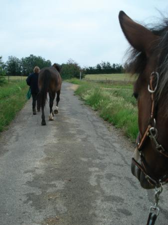 Déconnecté | Ben non, je n'ai pas de nouvelles photos. Promis j'en referais. Je tacherais de prendre ces pieds quand le pareur sera passé. Ben je pense que je vais travailler ça, tu as raison. Il faut juste que je trouve quelqu'un pour l'emmener mais ça devrait être jouable. Enfin, déjà l'autre fois on est sortie à 3 (l'ane, un poulain de 2 ans et Vaya). A un moment on avait les pieds dans l'eau (sauf l'âne) donc Paulette est partie un peu plus loin avec le temps que nous on patauge, ben la miss à pas aimé quitter son ane. |
