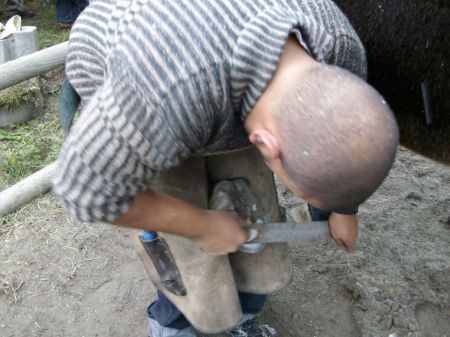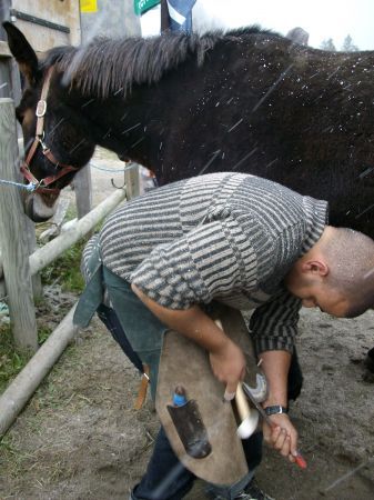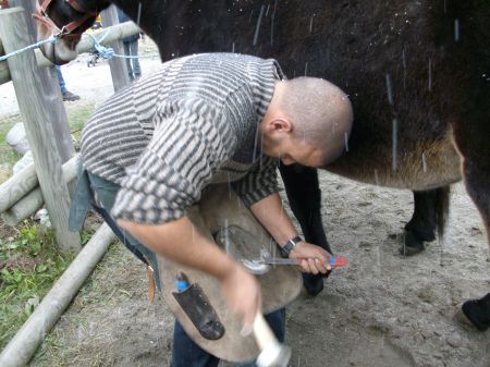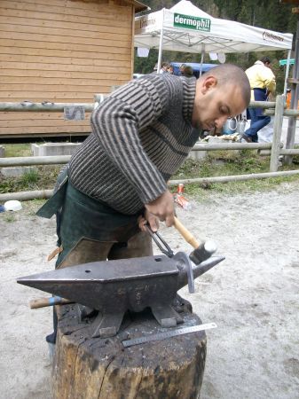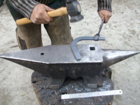 | Oui c'est le travaille d'un fer. Il commence par un lopin droit, et le travaille pendant un moment pour qu'il prenne la forme d'un fer qui s'adaptera au pied du cheval qu'il doit ferrer. Oui il a eu pas mal de succès. Les gens sont très intéressés de voir ce travail. Félicitation à lui de travailler dans ce froid et dans la neige, il ne s'est pas démonter pour autant et les gens ont été content. |