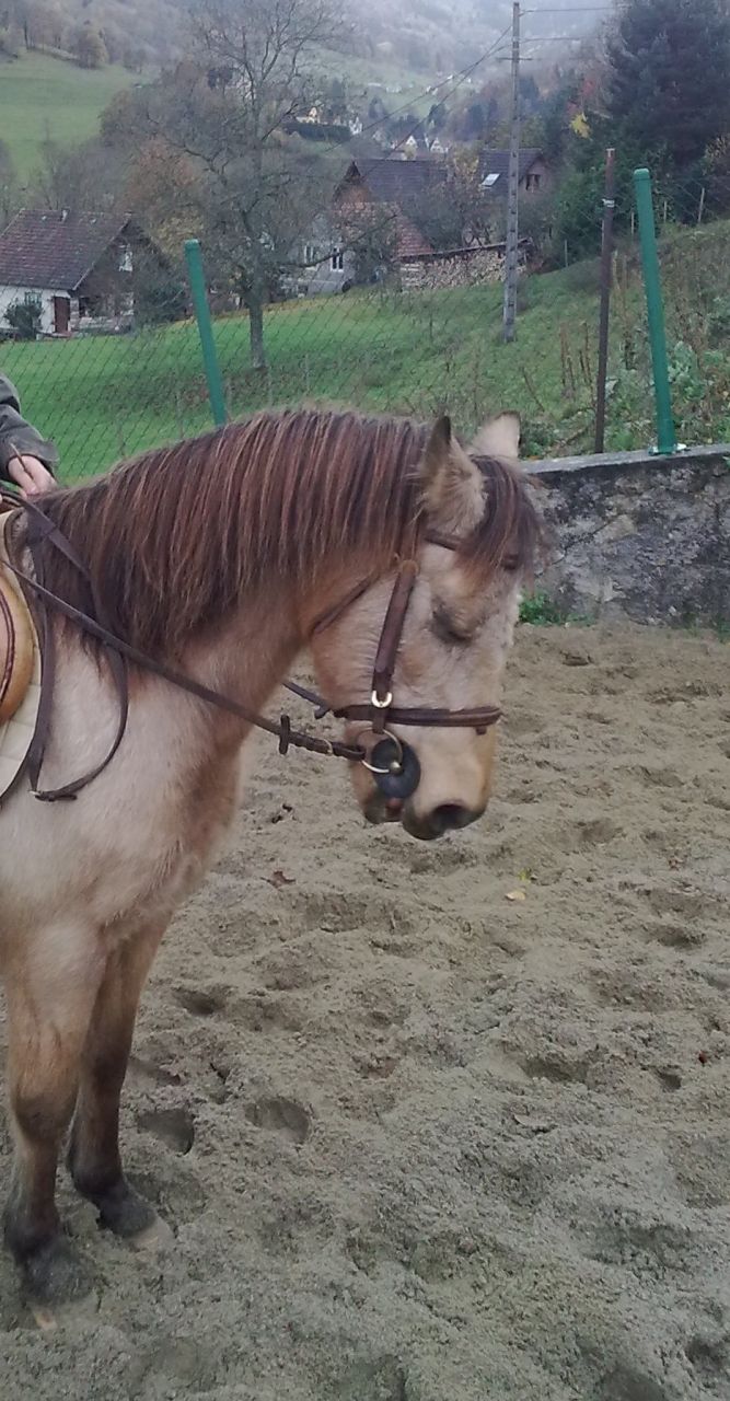 | Dire merci | Vue d' ici la position de la nuque parait plus haute que la ligne de dos, mais sans la photo en entier difficile de dire... Ce qui chaffouine plus, c'est la bouche ouverte. Ca ressemble au pseudo placé qu' on essaye d' obtenir en mettant le cheval à l' arret et en cisaillant la bouche... Et quand tu mets des photo en entier, renes allemande ou pas, tu as la main plutot dur, et les renes courte. Tu empeches ton poney d' aller vers le bas en l' enfermant dans son poitrail... Travail deja renes longue pour apprendre à toi et à ton poney de gerer leur poid et de s' equilibré. Une fois qu' il pourra tenir au trois allure tete rase motte, tu pourras envisager un equilibre concret, pas avant. Beaucoup de pas, un peu de trop, tres peu de galop... Tres mauvais le galop sur un cheval en sous equilibre. Il apprendra tout à l' envers et s' enfermera dans une ligne de dos brisé. |