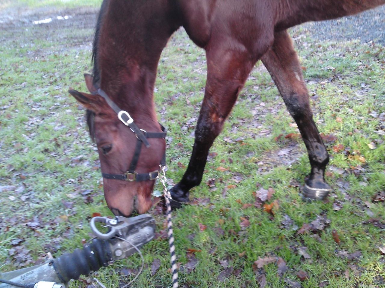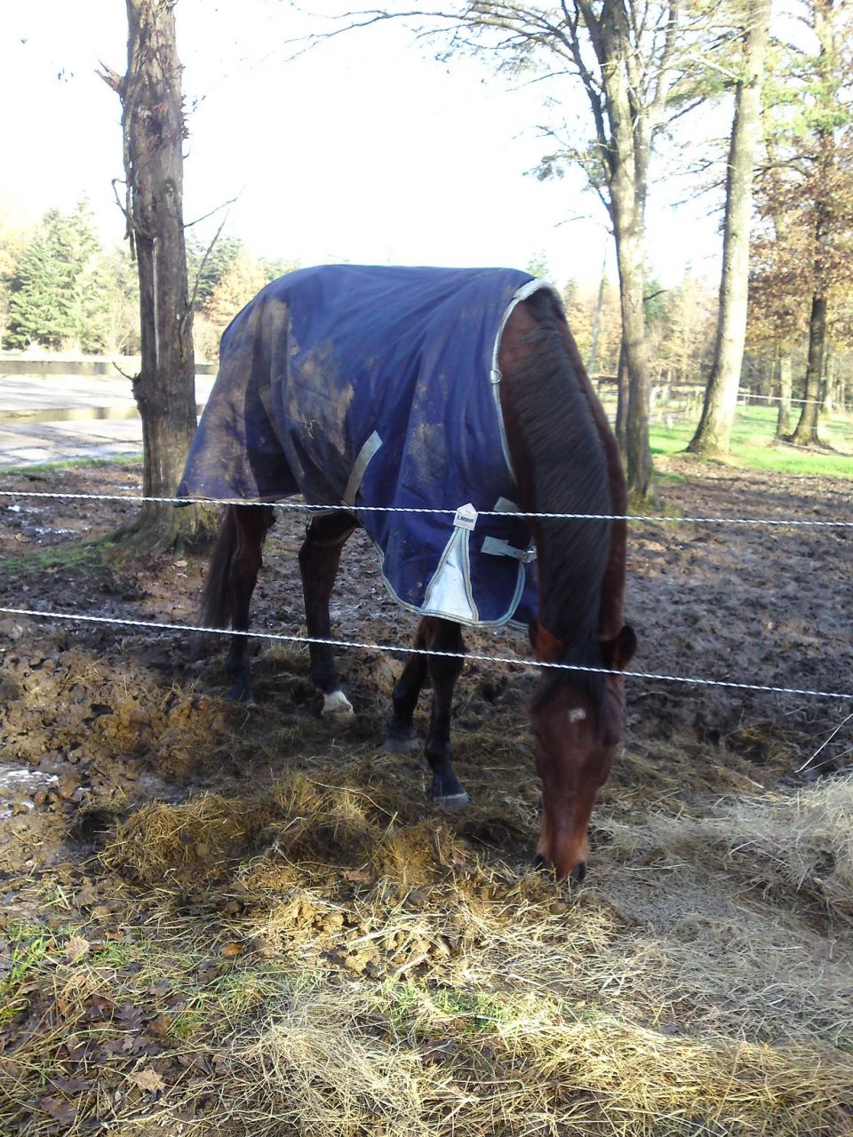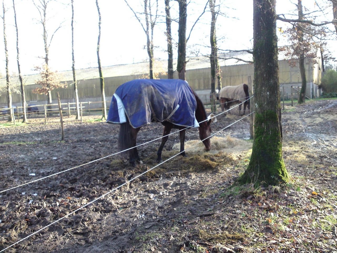 | Dire merci | Quelques petites photos de vendredi matin: Lasco dans son paddock (la gadoue, la gadoue et encore la gadoue)! Remarquez comme ça couverture est propre! Et encore, de l'autre côté, c'est encore pire, on ne voit plus du tout la couleur bleue!![]() ![]() |