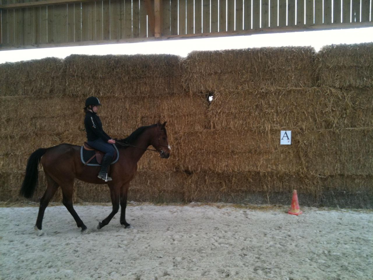 | Dire merci | C'est sympa tiens le mur en paille du manege Il a pas l'air stressé du tout au boulot et c'est déjà un bon point! Par contre; petite remarque (le prends pas mal hein!) tu chausserais pas un peu court? à mon avis en rallongeant, tu trouverais beaucoup plus ta place et ça t'aiderait peut etre pour ton probleme de départ au galop Il est bien mignon ce grand bai |