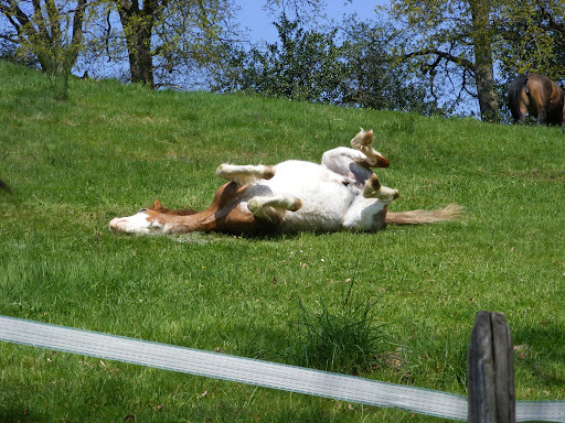 | Dire merci | Il faut dire que le verdict du véto, quand il m'a été donné, était que ce p'tit était blindé d'arthrose, à 10ans! Dommage!! Mais comme il devait être éducateur professionnel, je ne trouvais pas ça très gênant. Donc loulou se la cool douce en faite, et en bon maitre d'école il a fait de mon Saillon un entier bien dans sa tête, calme, qui joue avec lui et partage l'herbe verte de ses repas et les ombrages pour les grasses-siestes . La première année, nous sommes passés par les poux, les séances d'épilation, car Loulou ne perdait pas son poils d'hivers, les 2 premiers seulement, et à l'étrille c'était trop inefficaces. Alors je lui enlevais les poils à la main. Tous les jours un petit peu, j'aimais bien ses moments de "dépieutage" au milieu du pré.... Haaa!! Un peu de nostalgie m'envahit là!! Et puis, à force de le regarder vivre sa vie de pré-pré-retraité, je me suis appercue que petit poney très réfflechit était un petit malin. Il a une mémoire dingue!! |